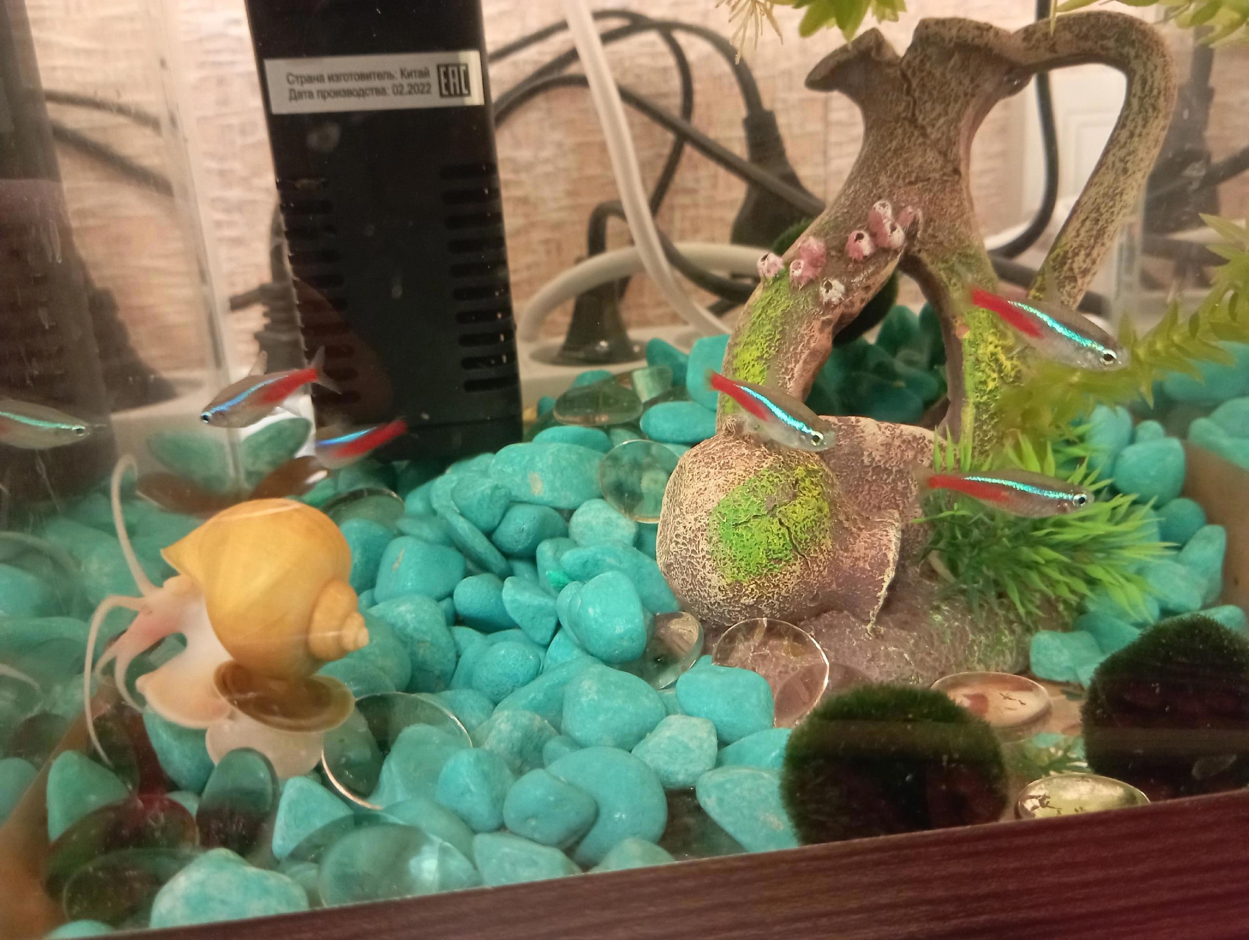 Коротенько напомню: у меня есть небольшой аквариум, в котором живут улитки ампуллярии и пятеро неонов (это такая маленькая яркая рыбка). В этом году у меня успешно получилось развести улиток, они дали многочисленное потомство, которое сейчас уже само почти взрослое и давно уехало в зоомагазин и другие дома. Из первого поколения нескольких детишек я оставила себе, пересадив в родительский аквариум.
