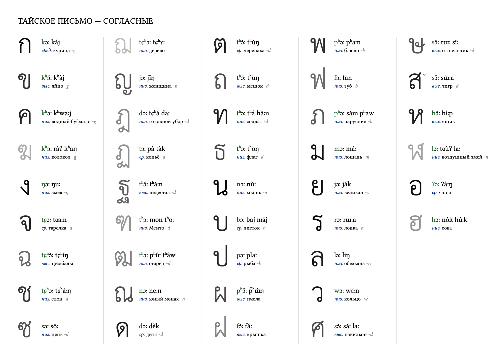 Содержит 44 согласных и 15 гласных знаков, которые могут комбинироваться сложным образом. Кроме того, в тайском письме нет пробелов между словами.