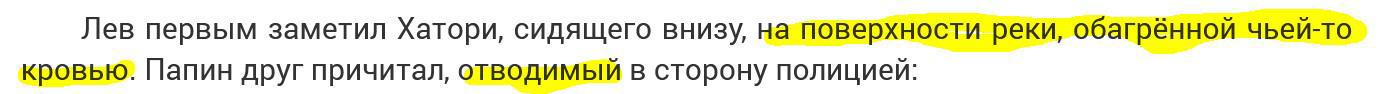 Желающие могут представить, как Хатори мог сидеть на поверхности реки (по контексту - лед) и одновременно быть отводимым полицией.