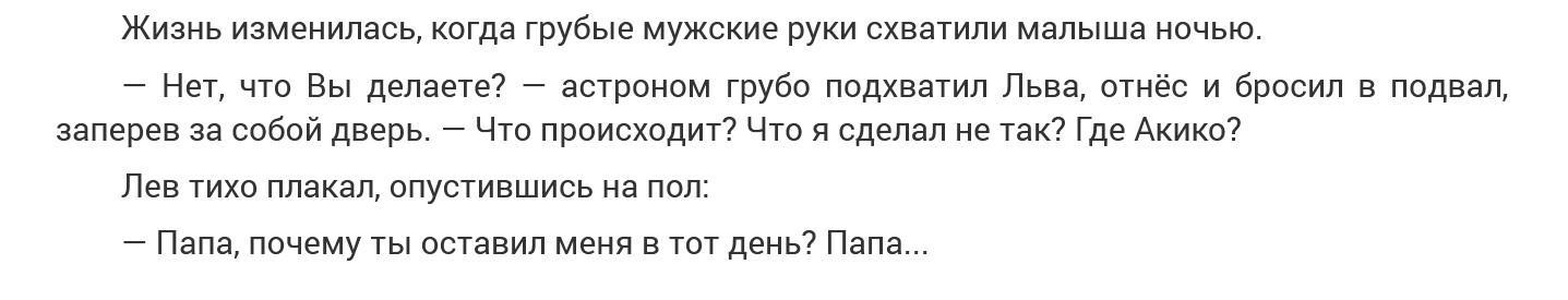 В самом деле, "что Вы делаете?" Объяснение внезапному беспределу (если это вообще объяснение) можно откопать только в одной фразе "Акико подросла". И что? Астроном заподозрил, что крошечный механический лев и его подросшая дочка могут заниматься не только наблюдением за звездами?