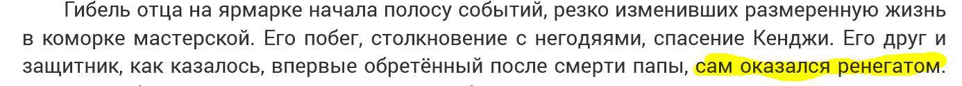Кенджи - мальчик-беспризорник, который приютил Льва. Мальчишки выживают, как могут - выступают на улицах и подворовывают. Почему Кенджи ренегат?