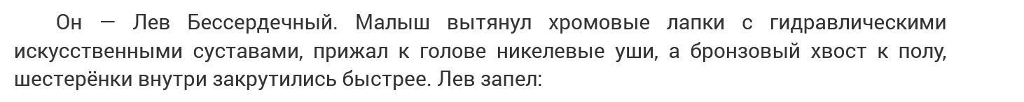Значит, это все-таки лев. Лев, который зачем-то носит полушубки и береты и поет. Возможно, лев без корпуса, раз видно, как внутри него крутятся шестеренки. Было бы описание в начале первой главы, цены бы ему не было! Хотя так и осталось загадкой, почему лев внезапно стал Бессердечным, поскольку во всех предыдущих главах никаких упоминаний о его бессердечности не было.