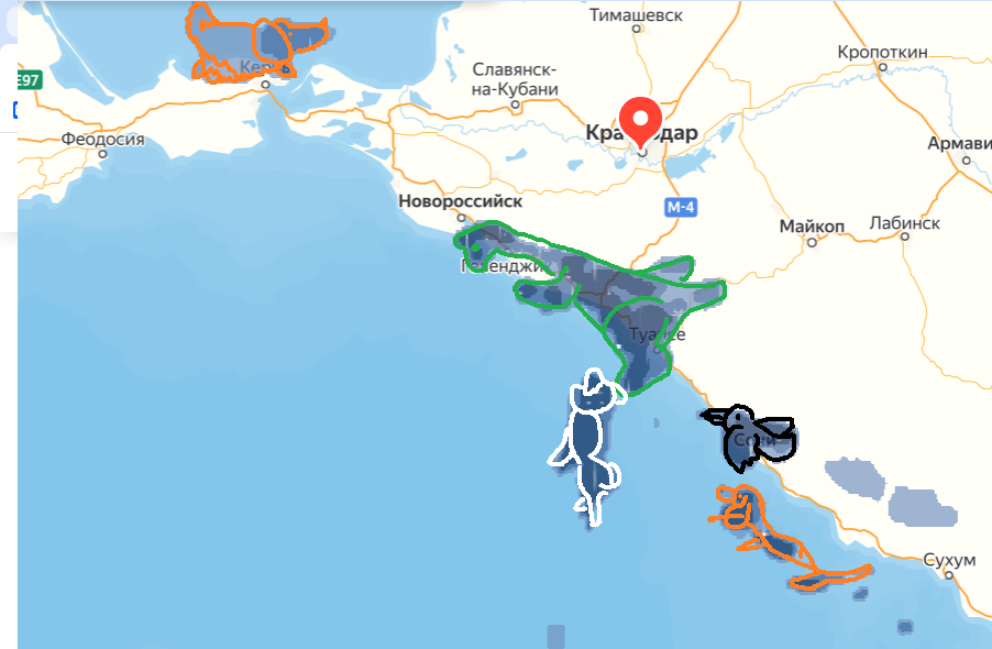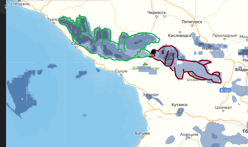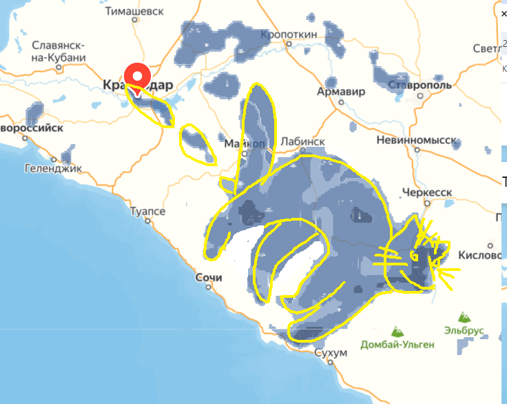 Вот этот котяра, возникший где-то в горах, ловко выпустил струю в сторону Краснодара, и у нас прошел долгожданный дождик... целых полторы минуты. Зато такими крупными каплями!