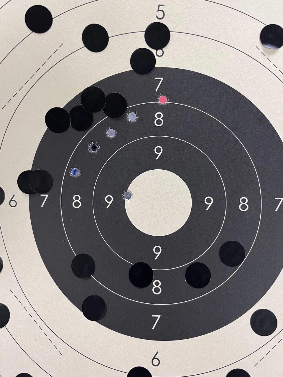 Последние шесть выстрелов я сделал каждый раз взводя курок, и получилось очень точно, я эти попадания не стал заклеивать. А так сложно стрелять из-за тяжелого спуска.