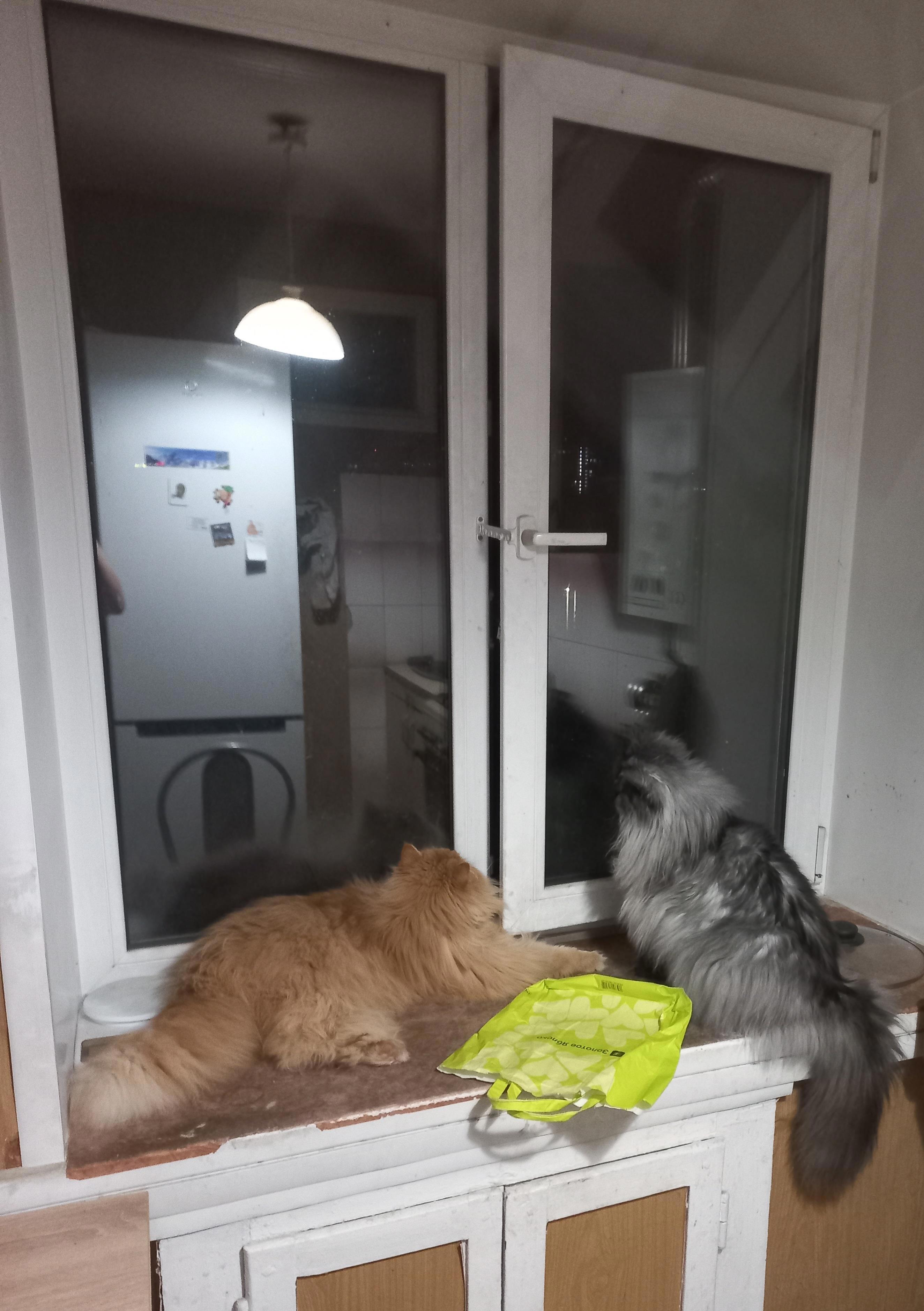 Автор: Юлия КартманРедкий момент, когда мои коты не палили, что делает хозяйка, не оборачивались, когда их фоткают, и что-то дружно высматривали в ночном пейзаже за окном.