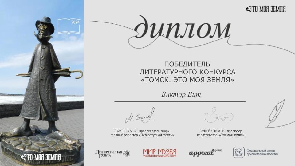 Автор: Виктор ВитСкажу честно, не очень в люблю участвовать в конкурсах, может потому что мне не всегда понятны критерии людей выбирающих победителей. Но я всё же решился по совету своих коллег попробовать ещё раз, и каково же было моё удивление когда моя маленькая легенда про город Томск заняла призовое место. Думаю всем писателям иногда тоже стоит пробовать себя в таких пусть и не совпадающих с их основным направлением творчества, стилях, вдруг вы откроете себя с неизвестной вам стороны