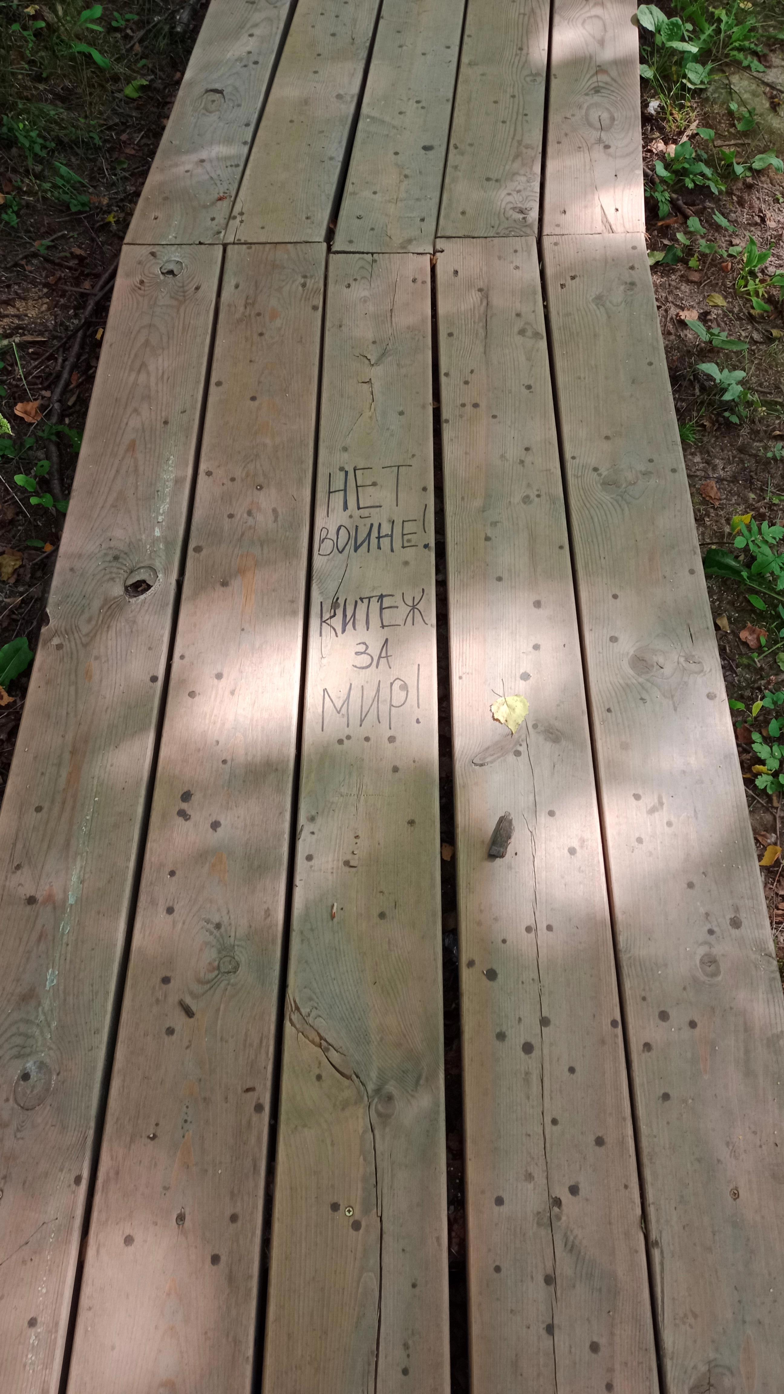 На деревянном настиле-дорожке, что идёт вокруг озера, какой-то прогрессивный написал: