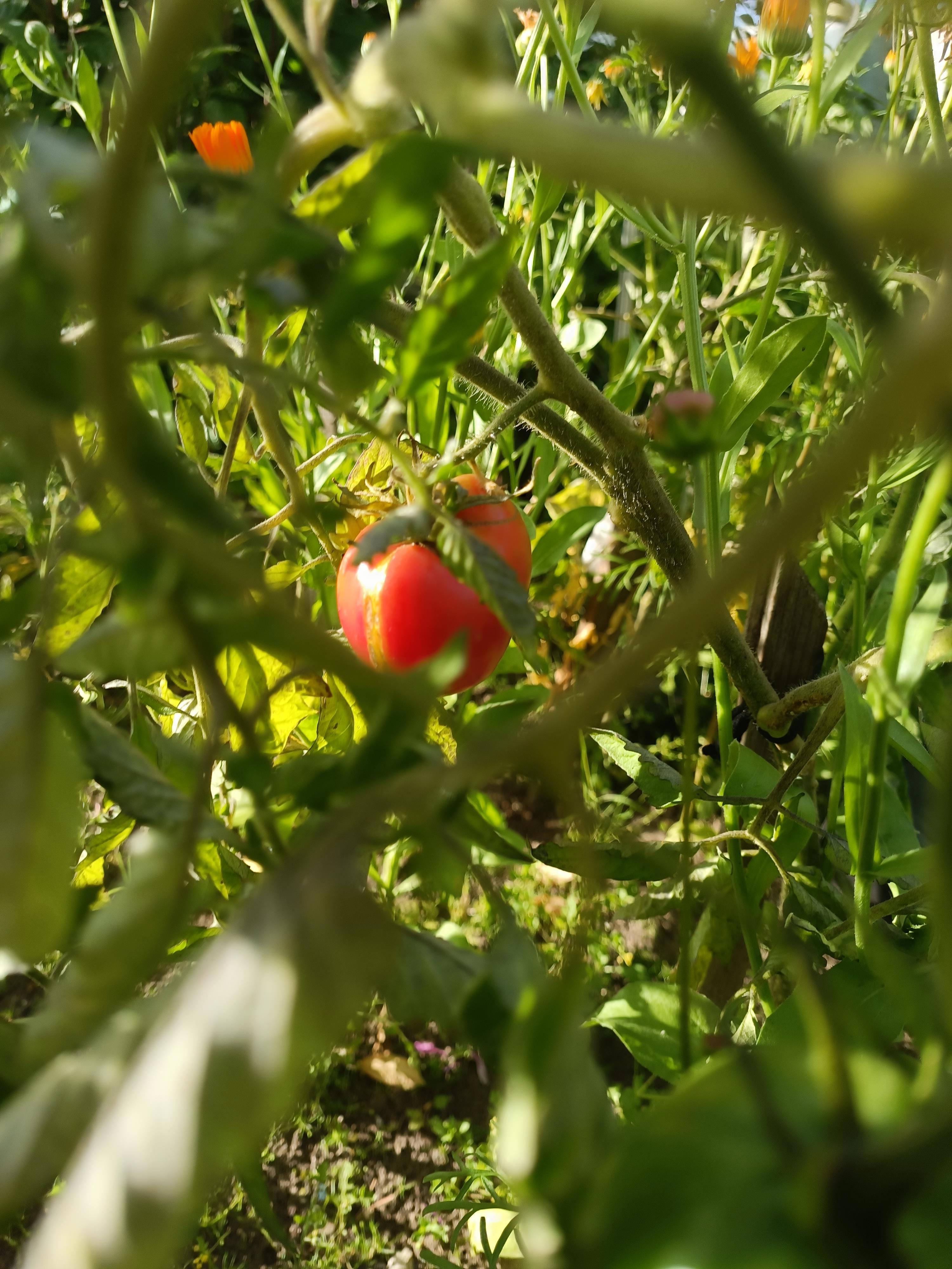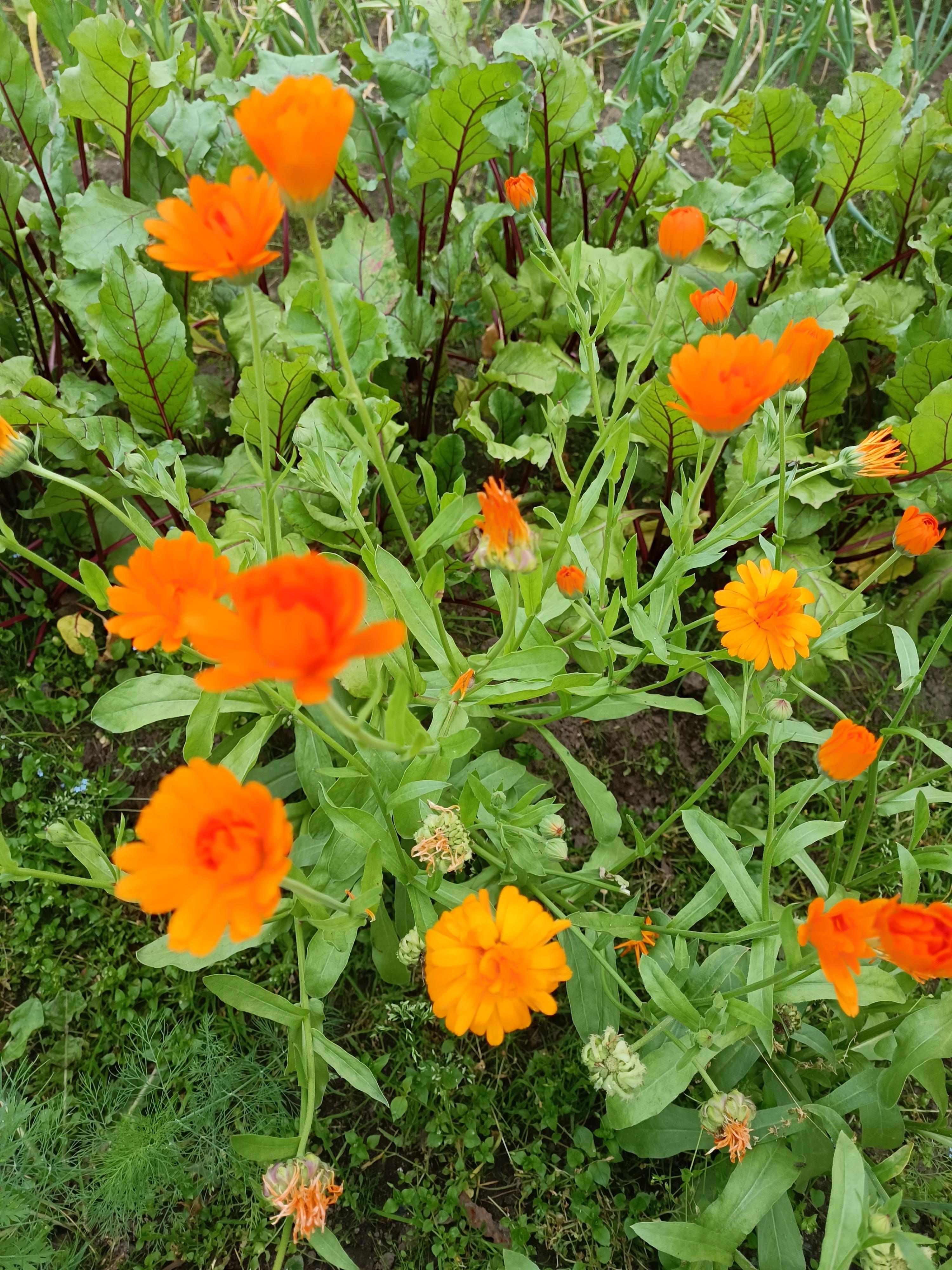 Это помидорчик явно покраснел со стыда. Потому как увидел, что негодница календула выросла посреди свеклы!