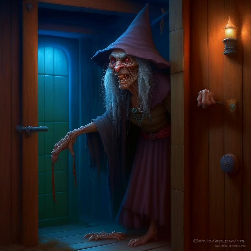 Дверь в избушке распахнулась, и из неё буквально вытекла лестница. В проём высунулась чудовищно древняя и не менее чудовищно уродливая старуха: