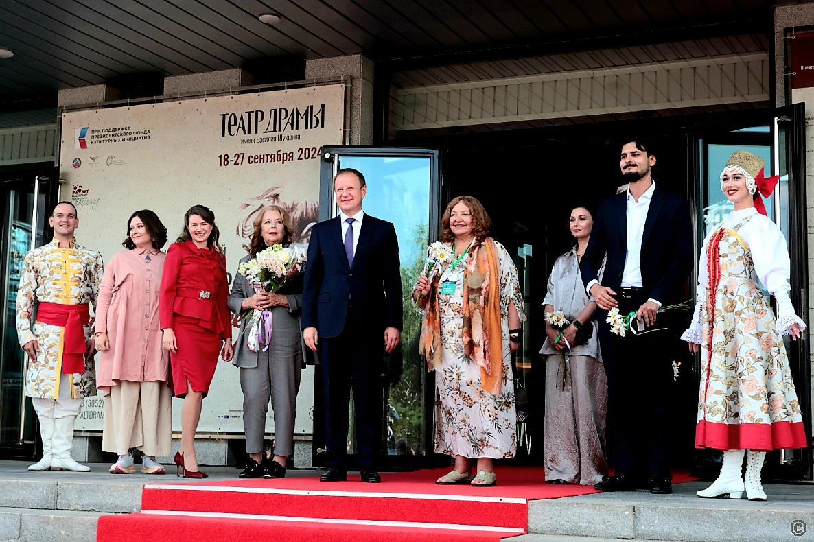 На крыльце театра драмы гостей встречали: наш алтайский губернатор Виктор Томенко и министр культуры Алтайского края, поэт Елена Безрукова