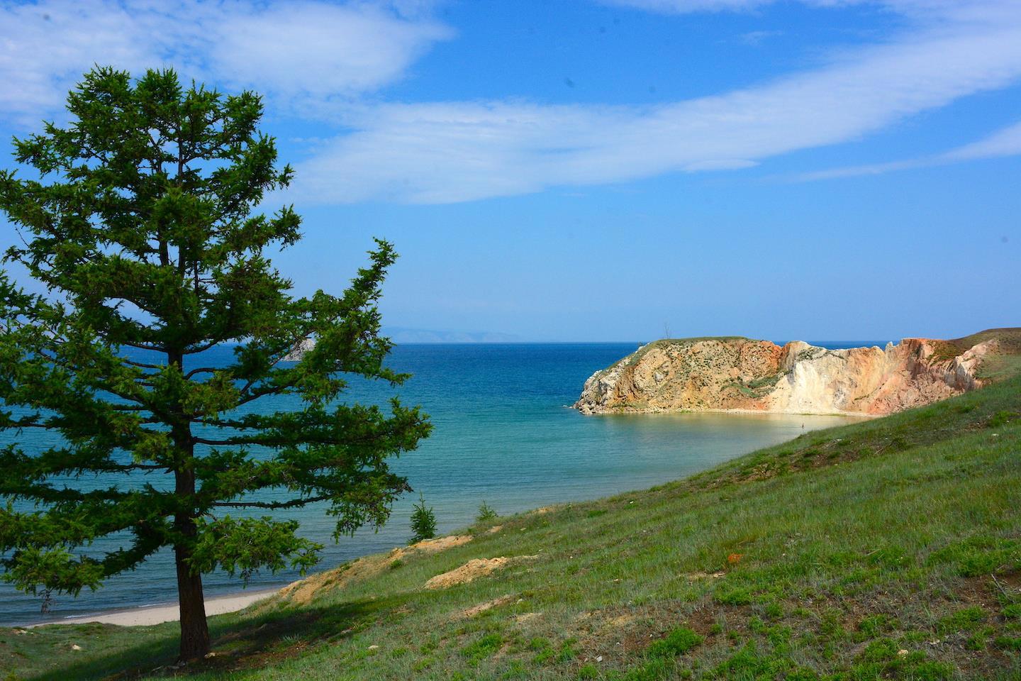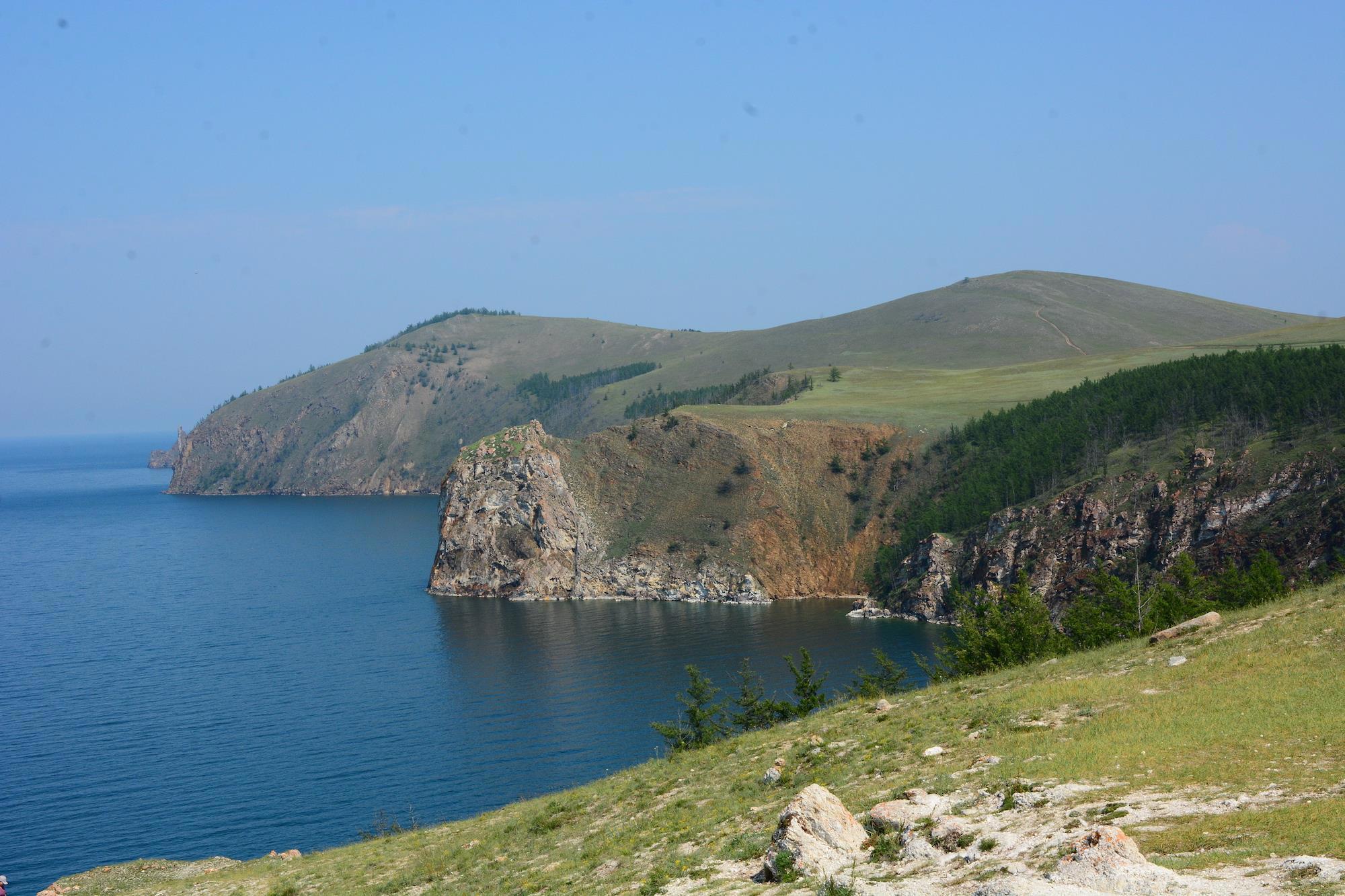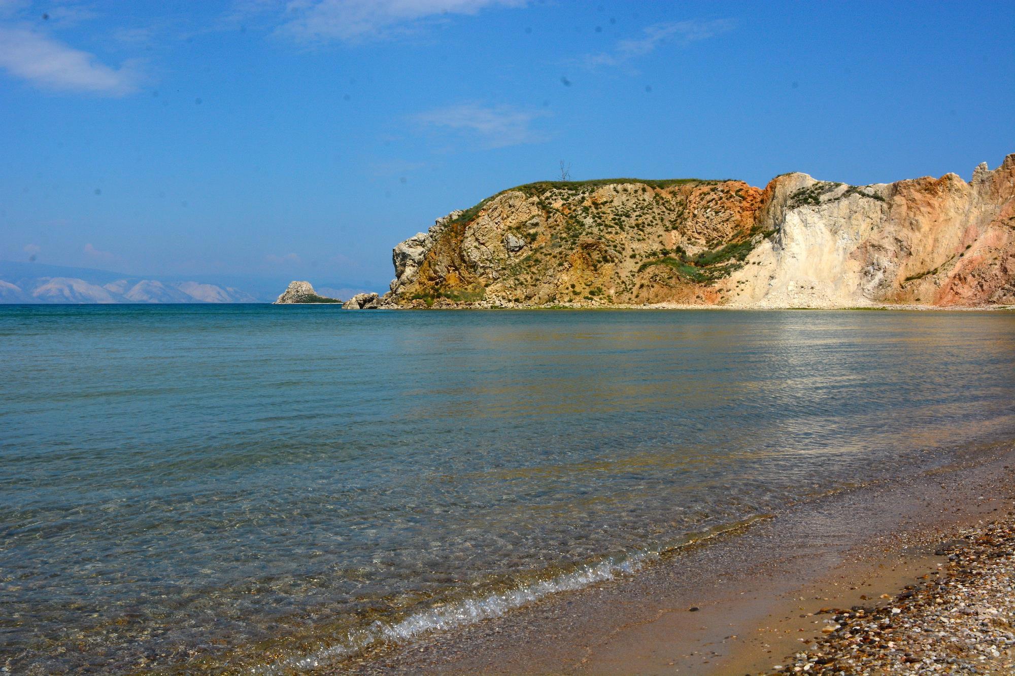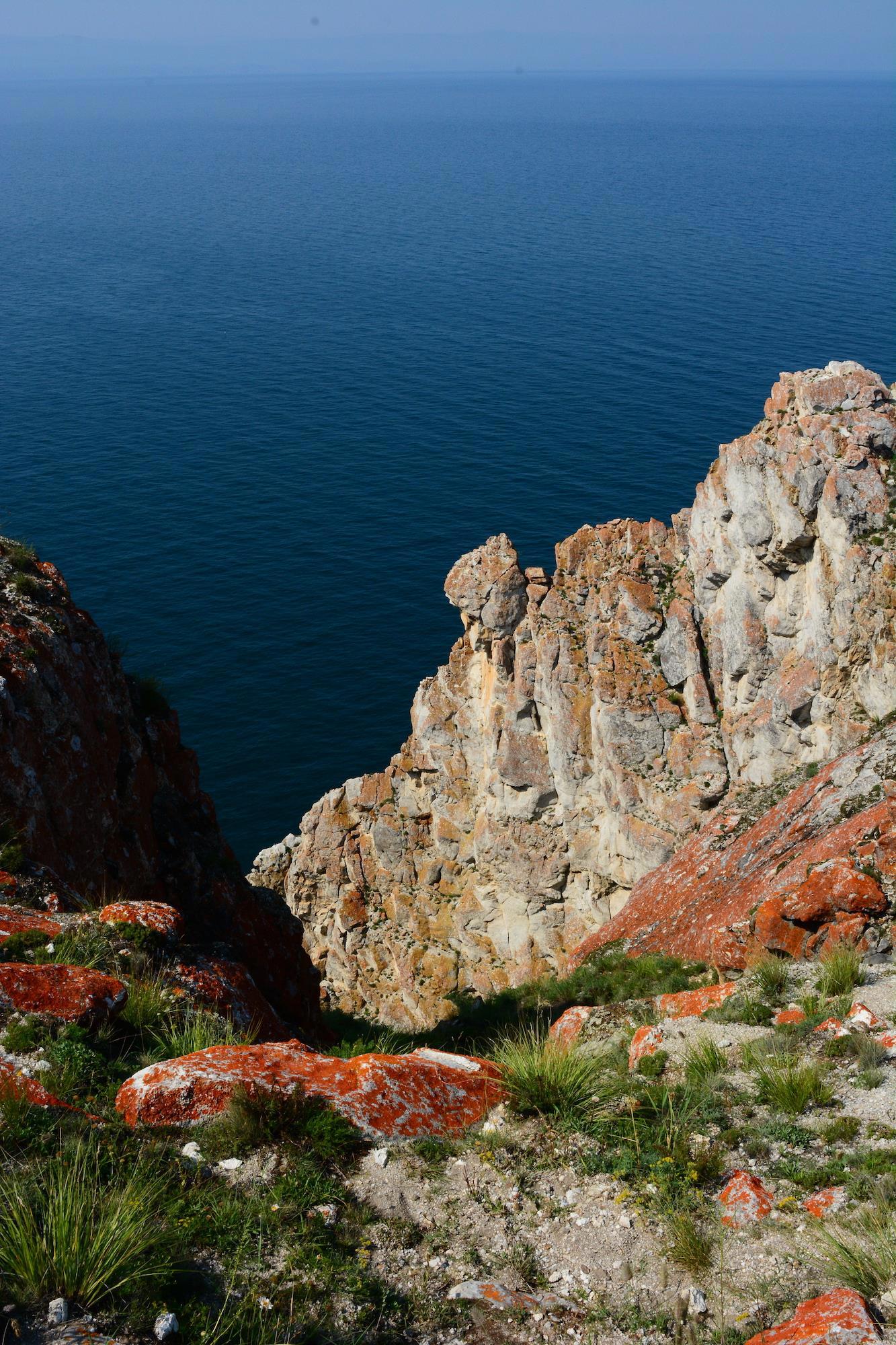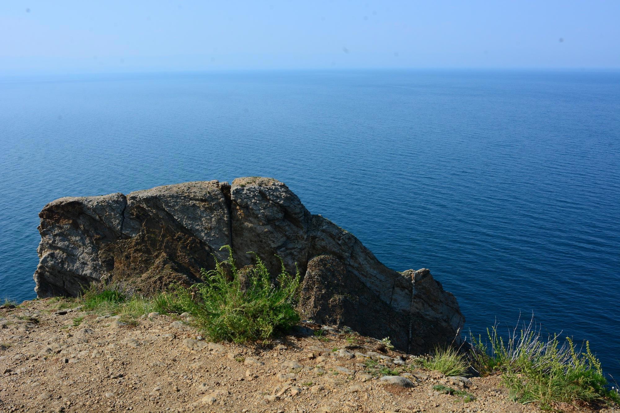 Квадратная скала, что дала название мысу - «зуб» в переводе. А вот Байкал поражает. Тут нет берегов. Синева воды от горизонта до горизонта. Самая широкая часть 82 километра чистой открытой воды. Да еще справа от мыса самая глубокая точка 1600+ метров. Обалдеть!