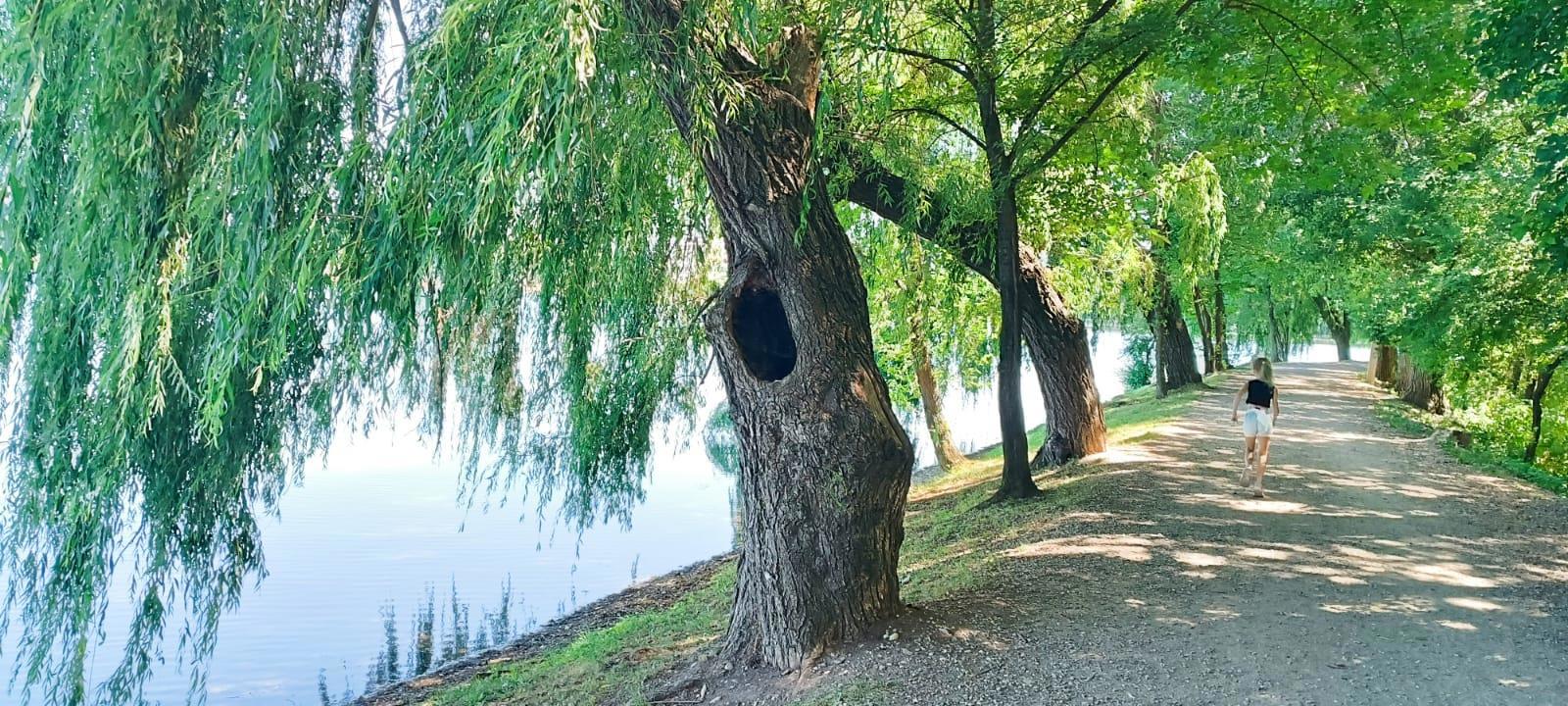Вся территория очень ухоженная. Вокруг все зеленое. За озером лесополоса. Идти было невероятно приятно. Мы были, кстати не одни. Кто-о шел со скандинавскими палками, кто-то бежал легкой трусцой, кто-то ездил на велосипеде. И пока мы шли, один человек проехал круга 4.