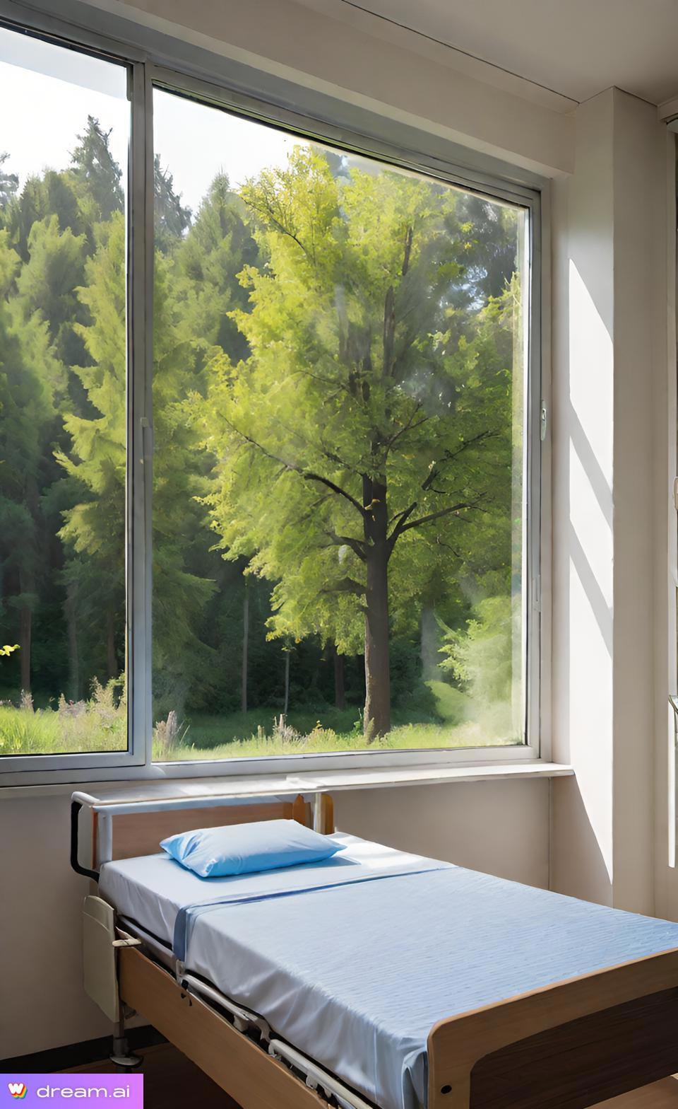 Почему этот первый вариант мне понравился – в нем деревья с улицы «залезают» в палату, буквально просачиваются сквозь окно и оказываются внутри комнаты. Так в жизни не бывает, и именно такой «магический реализм» мне был нужен. И был у этой картинки какой-то правильный мистический зеленый цвет – это отлично перекликалось с другим рассказом сборника: «Дверь зеленого цвета».
