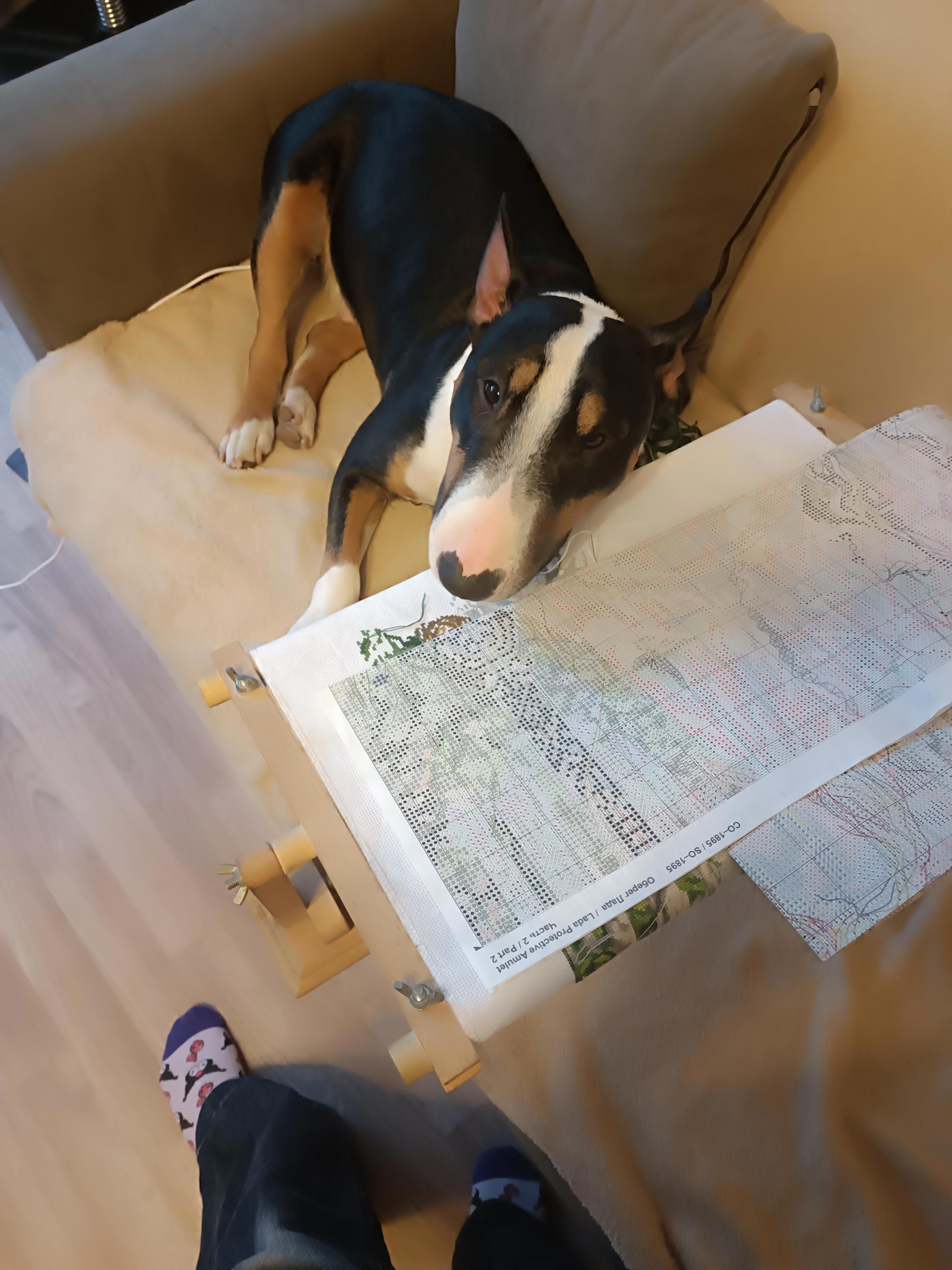Я уже как-то писала пост о литературных неграх, коих у меня целых два. Но время не стоит на месте. Это у Успенского выдуманный Матроскин крестиком вышивал. А у меня самый что ни на есть всамделишный бультерьер этому искусству тонкому обучен.
