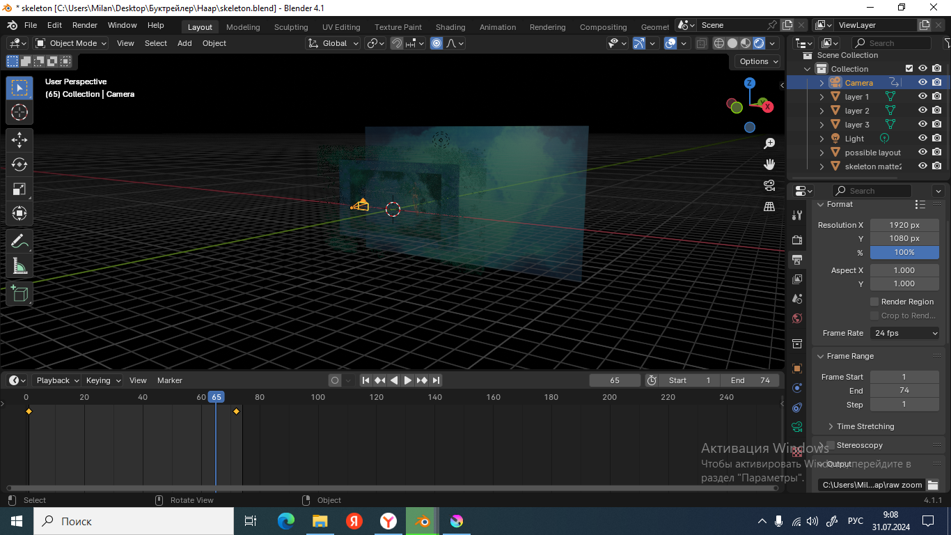 Даже в сцене со скелетом, полностью состоящей из 2Д-картинок, Блендер пригодился - чтобы камера двигалась вглубь, через слои тины.