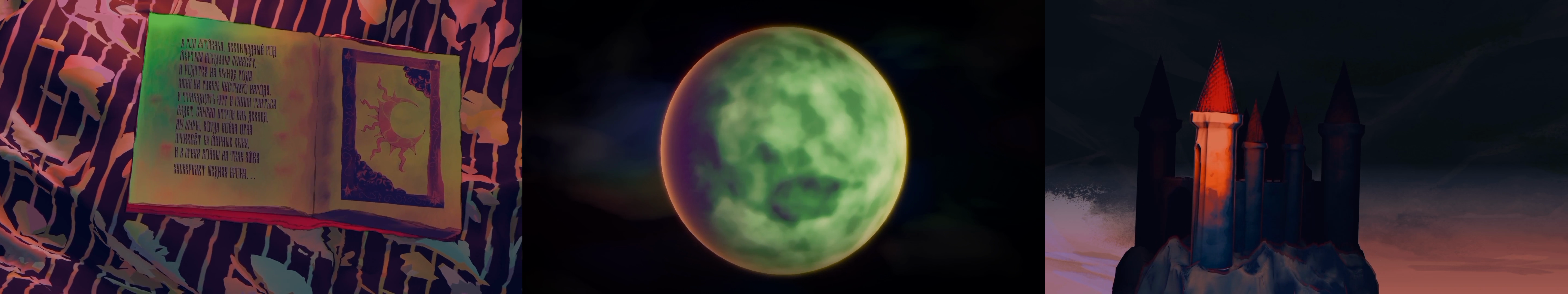 Книга, луна и замок - очень простенькие модели, раскрашенные примерно так же, как скалы в другом видеоуроке с Ютуба, и кое-где контур.