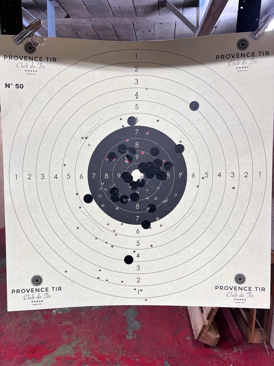 То, где выстрелы за черным кругом, это я стрелял двойками на скорость и просто всю обойму выпускал за раз, там естественно разлет больше. Но тем не менее все в силуэт ушло.