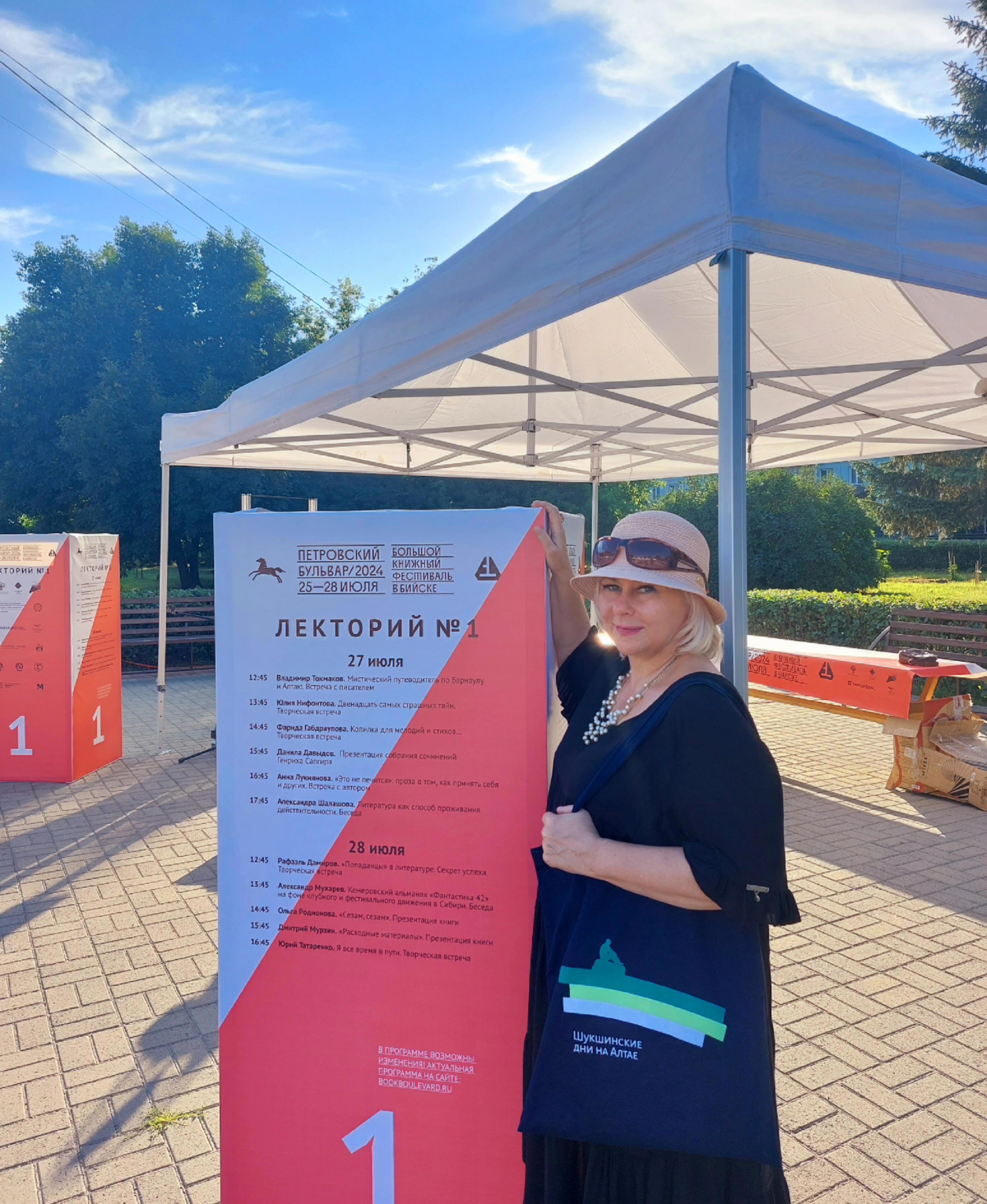 Накануне вечером, когда хотя бы чуть-чуть спала испепеляющая жара, мы с друзьями писателями гуляли по Петровскому бульвару, месту где располагались основные площадки книжного фестиваля в Бийске (Алтайский край) и я сфотографировалась рядом с афишей у открытого пустого пока что лектория.