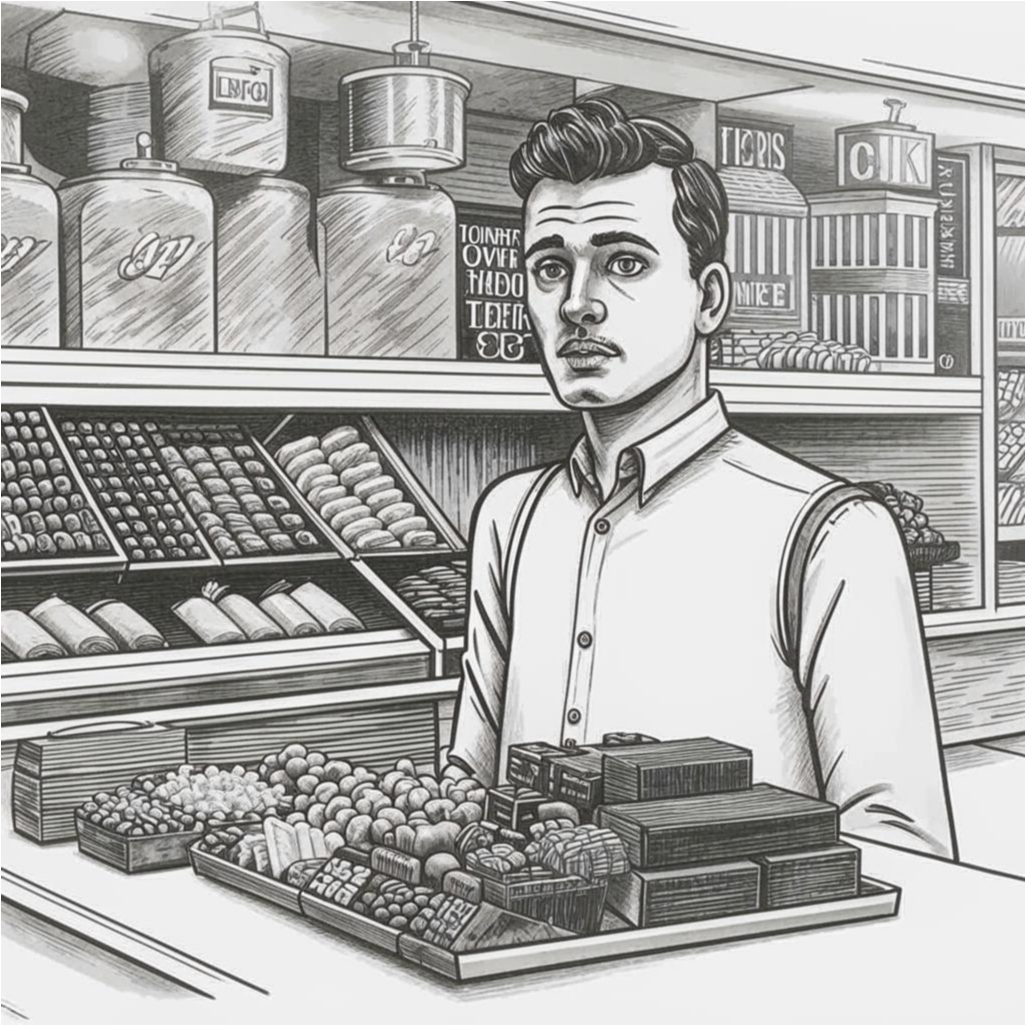 Тот самый журналист, который выглядит довольно обеспокоенно. Почему так, ведь он же пришел в кондитерскую лавку!