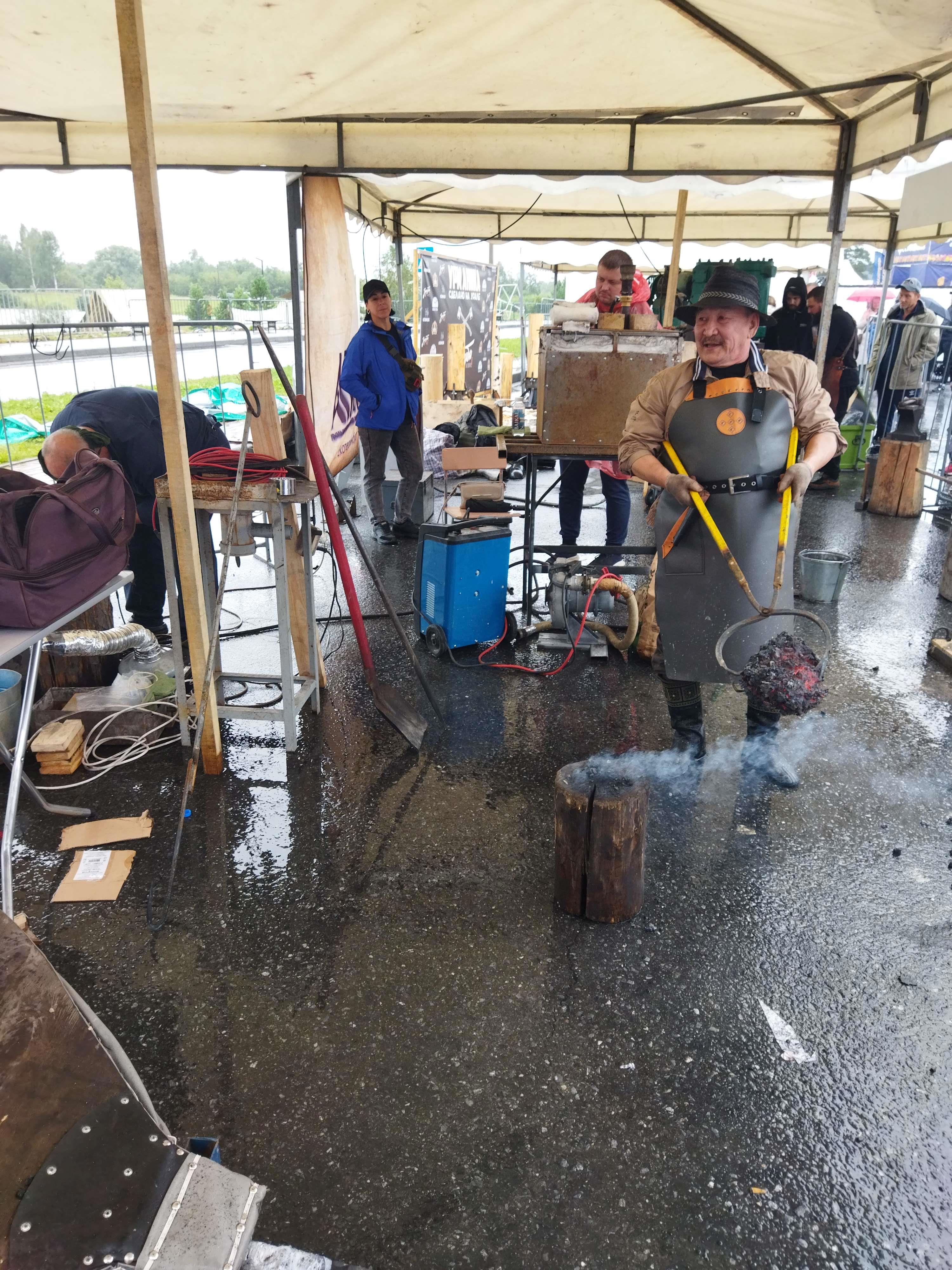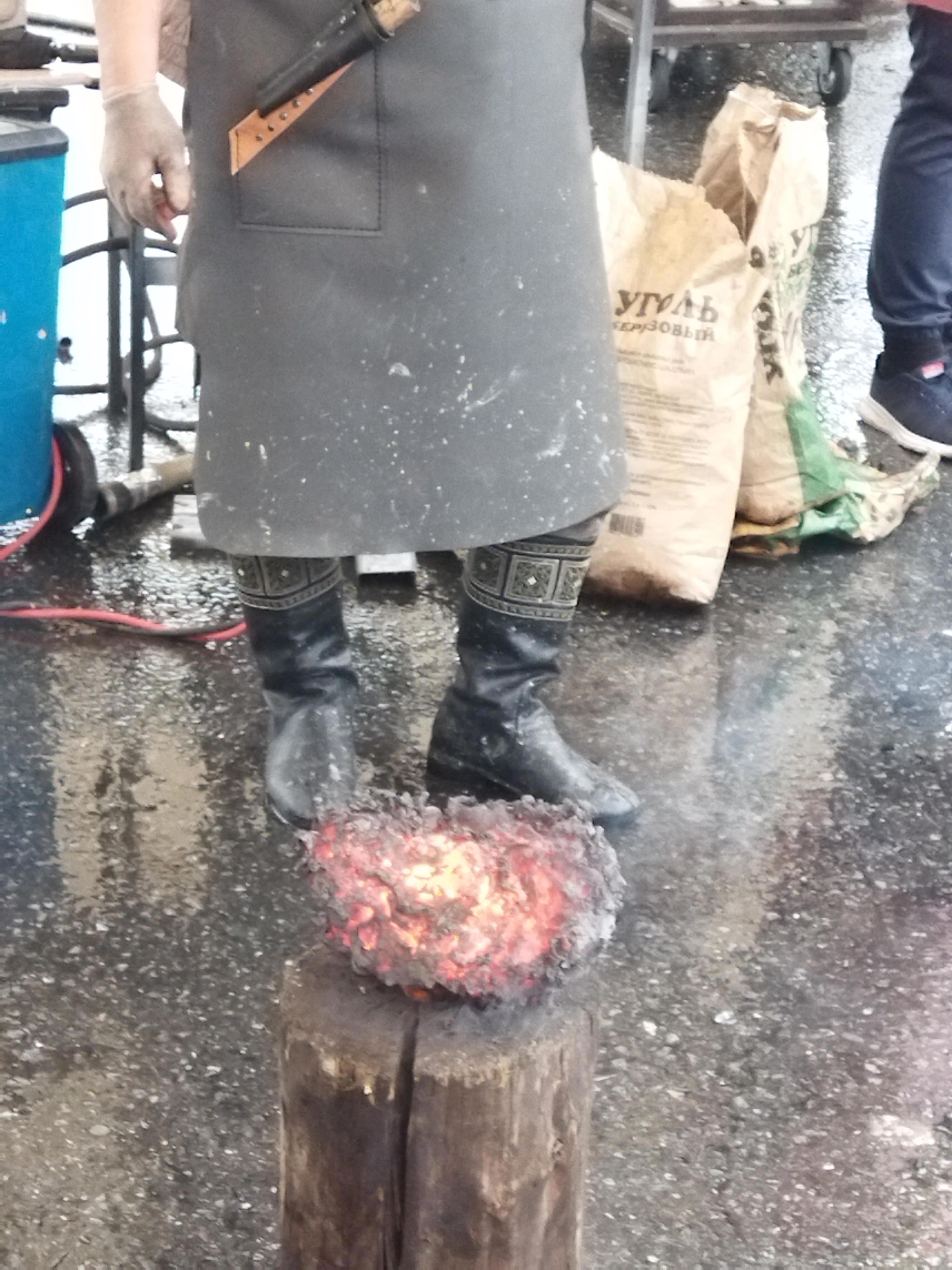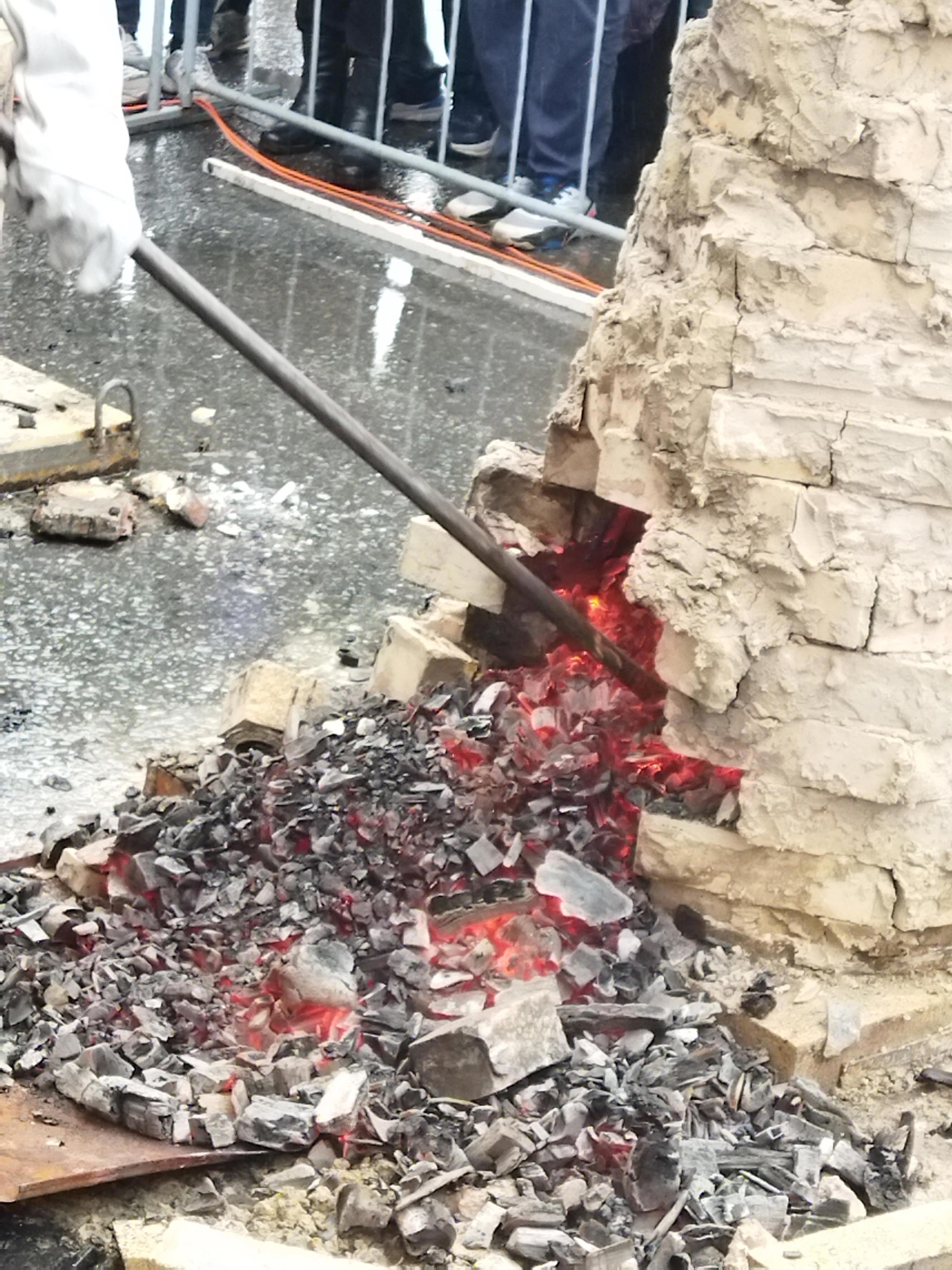 Мне удалось заснять несколько кадров получения железной крицы из печи: