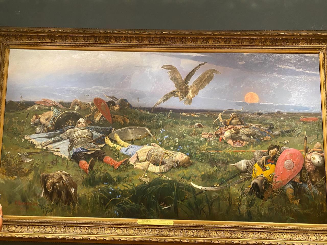Васнецов известен своими картинами на исторические и мифологические темы. В детстве не замечал, а теперь, когда читаю и пишу боярку, ну и историю, изучаю оружие, вижу не совсем достоверные моменты сцен со сражениями. Но картины его – мощные и выразительные. "Богатырей" даже не стал фотографировать. Это целая история, рассказанная через выражения лиц, позы и детали. Я чувствовал их мощь и силу, и готовность защищать свою землю от врагов. А вот фото "После побоища Игоря Святославича с половцами". Тут цвет и композиция, разбросанные доспехи и выражения лиц погибших воинов, которые говорят о величии и трагедии прошедшей битвы.