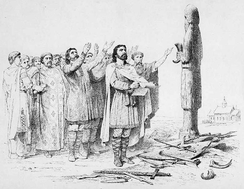 Князь Игорь и его дружина клянутся перед идолом Перуна, сложив своё оружие. Иллюстрация художника В. П. Верещагина из альбома «История Государства Российского в изображениях державных его правителей с кратким пояснительным текстом», 1896.