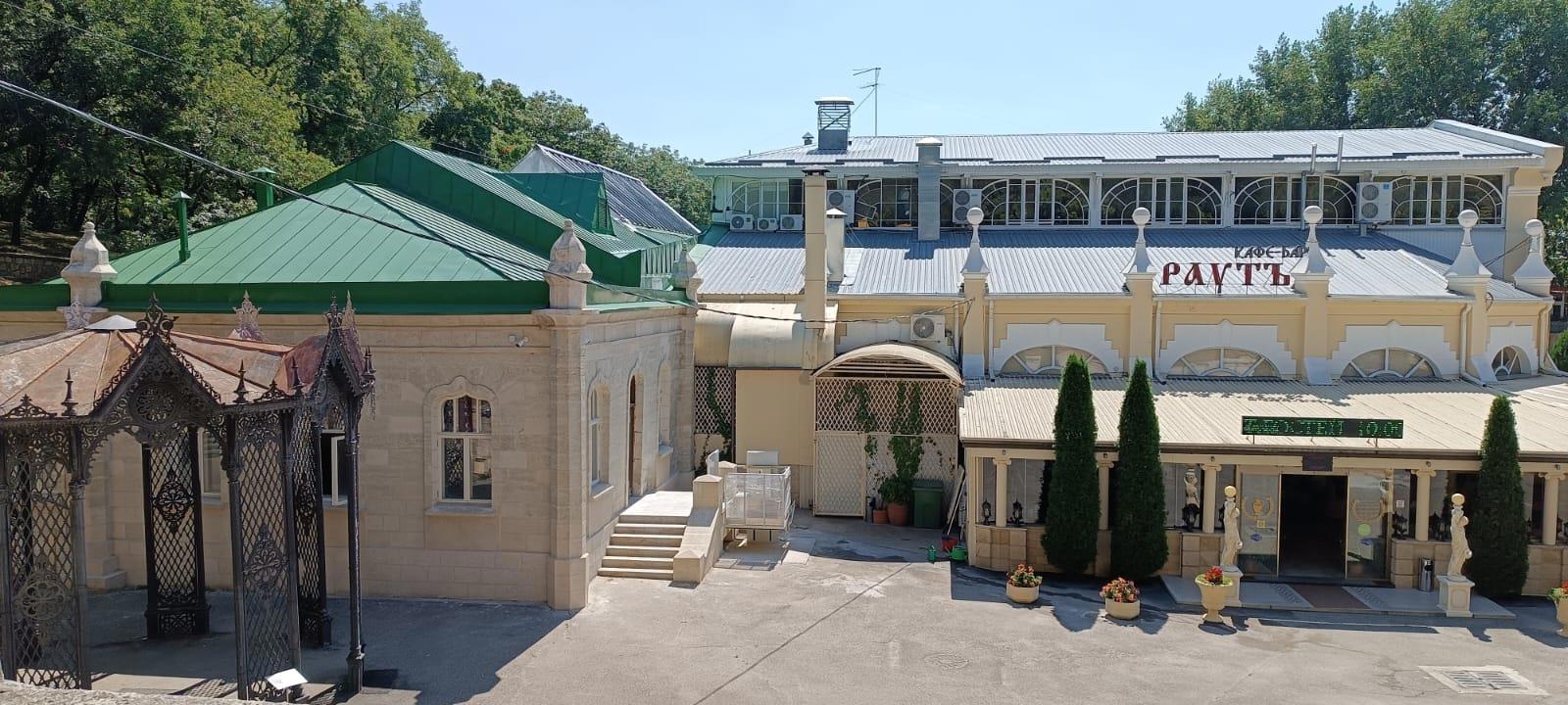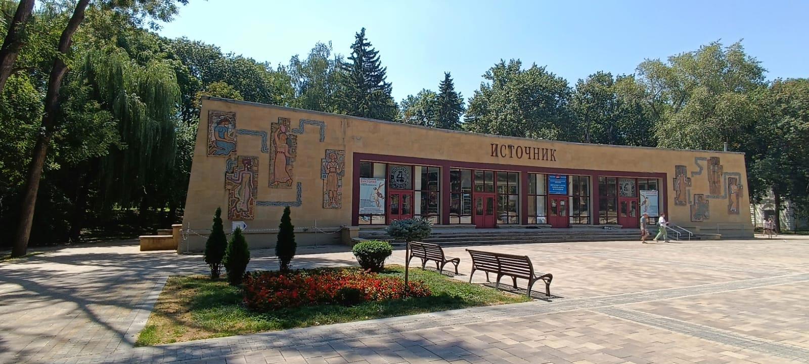 Слева от "Раутъа" необычное строение. Именно там был первый Источник 17. Был просто краник и там подавалась вода. Висела кружечка на цепочке. Чуть позже помещение для Источника №17 построили справа от "Театра-парка". Внутри там много мозаики и оно достаточно интересно. Но сейчас здание реставрируют и фотки сегодня не будет.