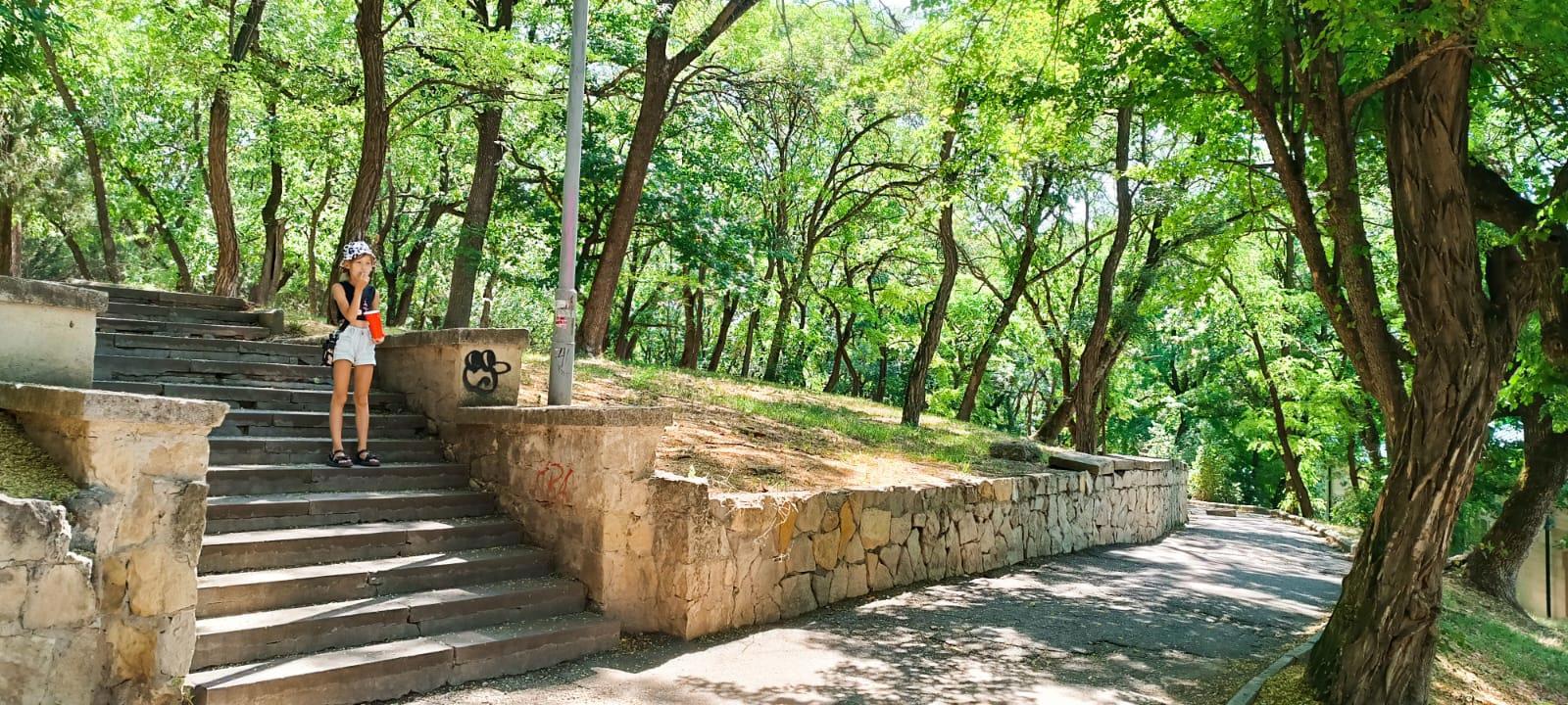 В парке все утопает в зелени. Солнца не замечаешь, потому что все в тени и дышать невероятно легко.