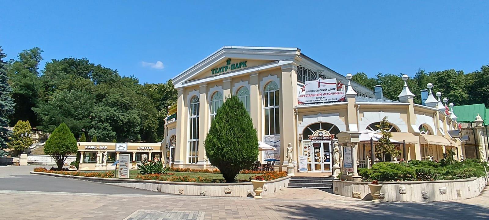 За фонтаном сразу здание, которое называется "Театр-парк". Его построили в конце 19 века одним из первых. И именно здесь проходили концерты известных в то время музыкантов, певцов и поэтов. Там выступал и Маяковский, и пел Федор Шаляпин, и танцевала Айседора Дункан и многие другие.