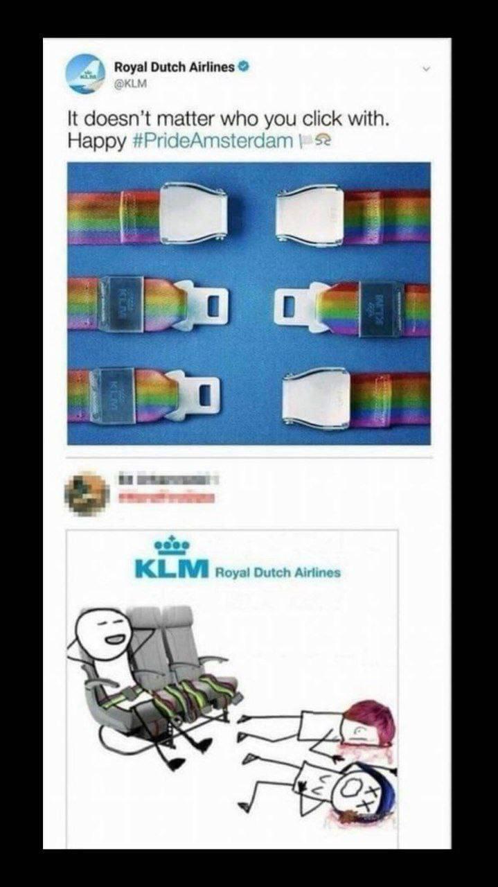 Датские королевские авиалинии решили быть в тренде и выпустили такую свою рекламу - с ЛГБТшным лозунгом, типо неважно кто с кем. Пассажиры отреагировали ехиндой карикатурой.