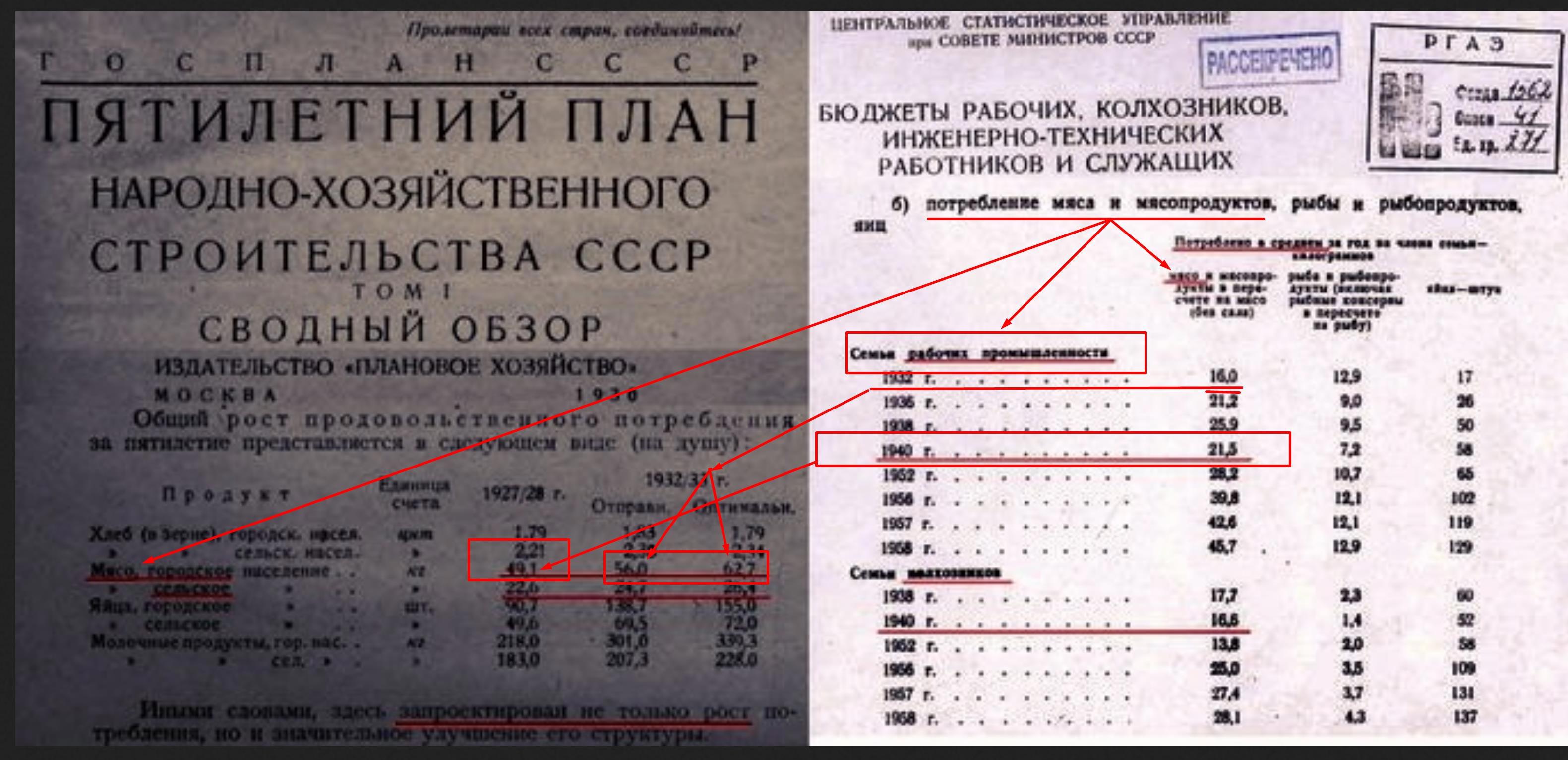 Фиксируем цифры на период 1927-1928 потребление мяса и мясопродуктов городским населением составило 49,1 кг на одного человека в год. На селе данная цифра была равна 22,6.
