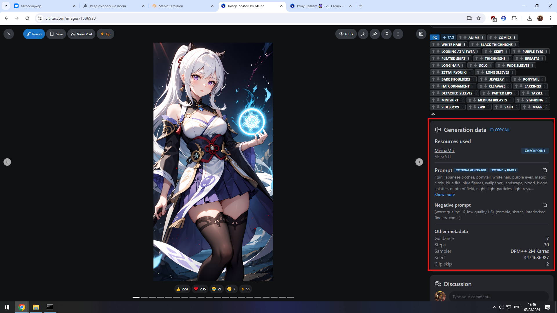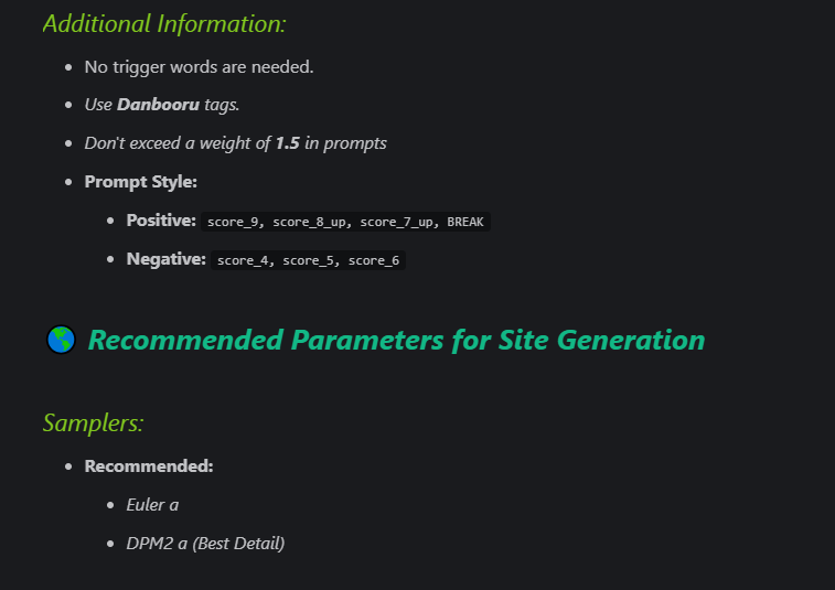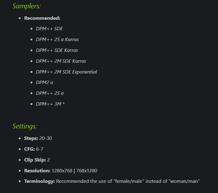 Альтернативный вариант - скоммуниздить параметры генерации у кого-нибудь другого. Все изображения на civitai открываются и в 90 процентах случаев у них будут показаны все параметры задействованные при генерации. От моделей и лор, до промта, разрешения и т.д. Поэтому можете ткнуть на любое изображение вверху на странице модели и глянуть что использовал её автор, либо пролистать чуть ниже и посмотреть какие параметры выставляли пользователи.