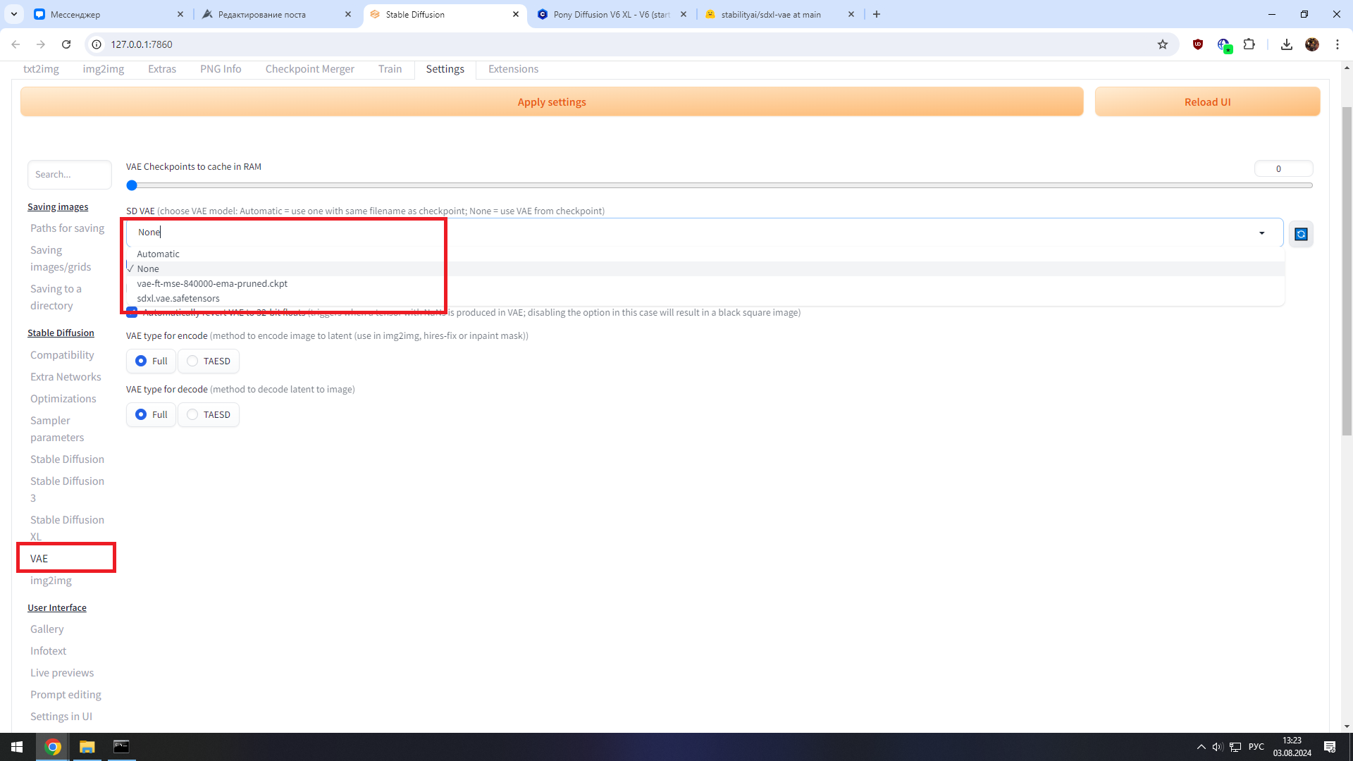 Если говорить проще, они помогают улучшить качество нашей картинки. Для старых моделей например SD 1.5 лучше всего использовать vae-ft-mse-840000-ema-pruned.ckpt