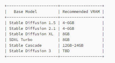 Нашёл в интернете табличку с рекомендуемыми требованиями для некоторых моделей. Опять же отталкивайтесь от характеристик вашей видеокарты. У меня например RTX 2060 12 GB этого мне хватает для использования XL и пони моделей.