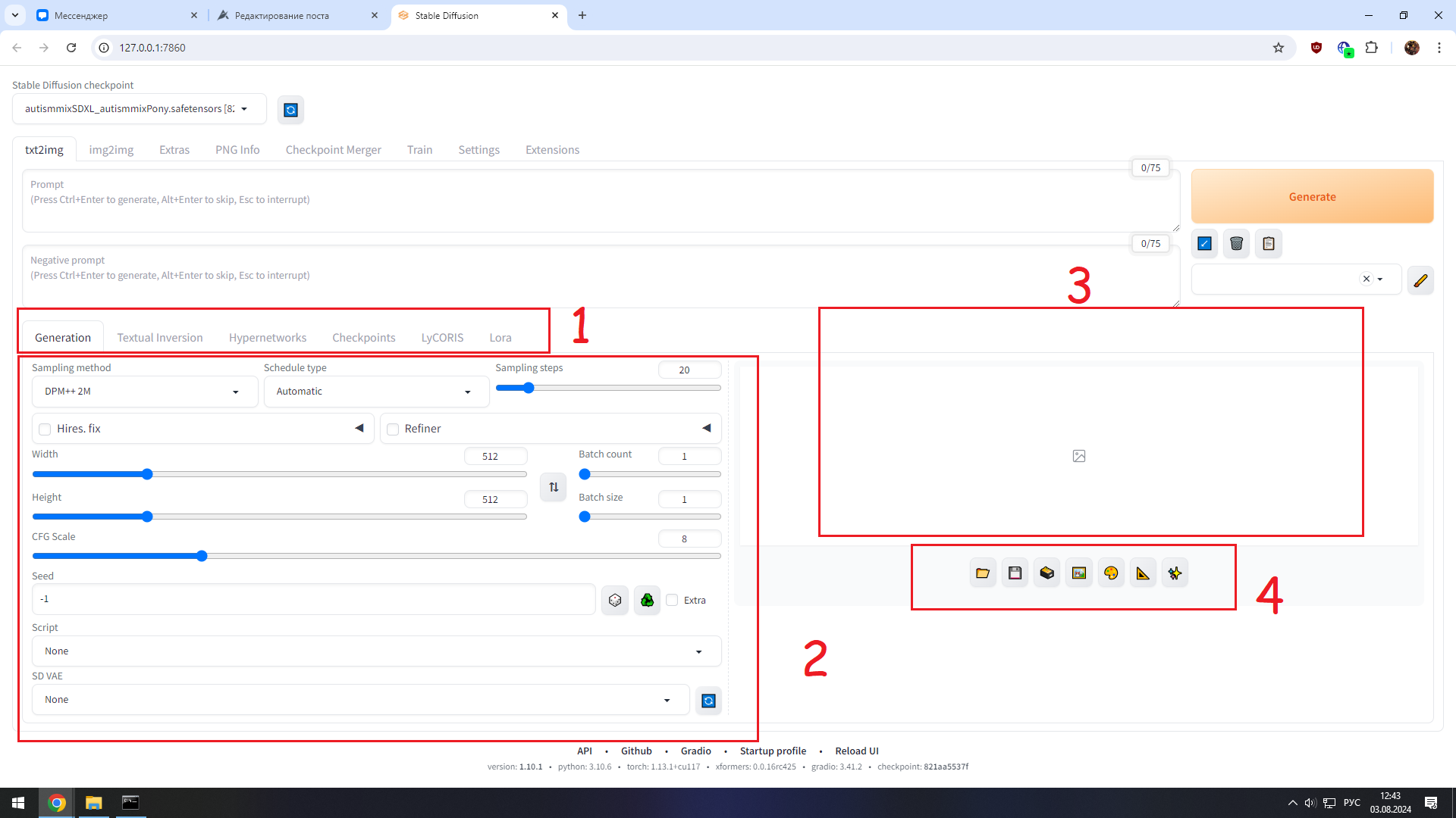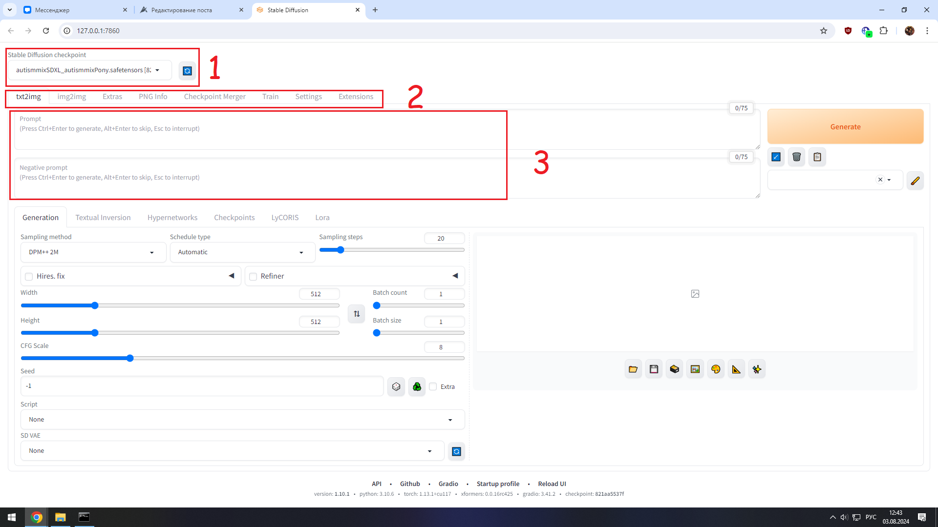 2) Окошко с параметрами генерации (на скрине конкретно показано для txt2img, другие разделы будут чуть отличаться)