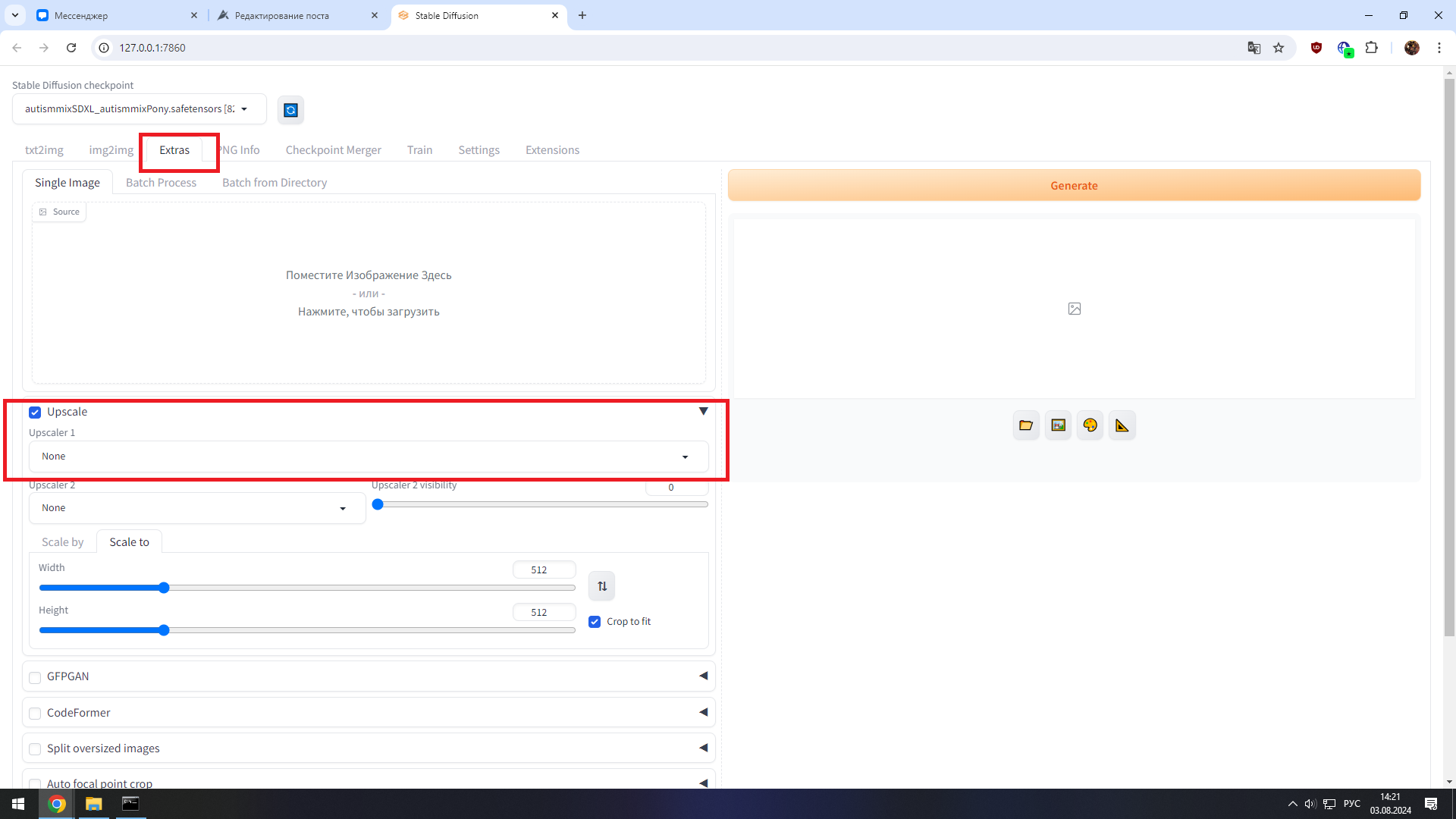 Для этого мы напрямую переходим во вкладку "Экстра" и загружаем наше изображение, либо делаем это через иконку с треугольником. Затем внизу жмём галочку напротив upscale и в 1 же поле выбираем ESRGAN либо R-ESRGAN (это базовые апскейлеры, которые у нас есть изначально. Можете скачать и другие в интернете, например Remacri).