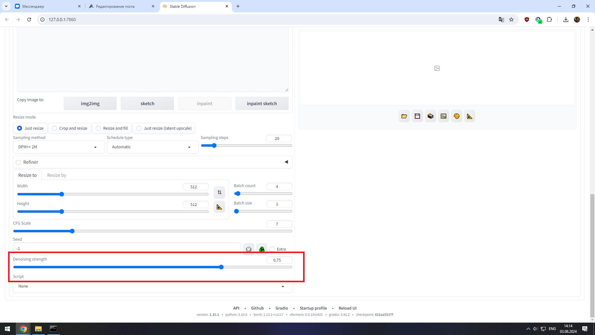 Ну и в самом низу, под параметрами генерации у нас есть такая шутка, как Denoising strength