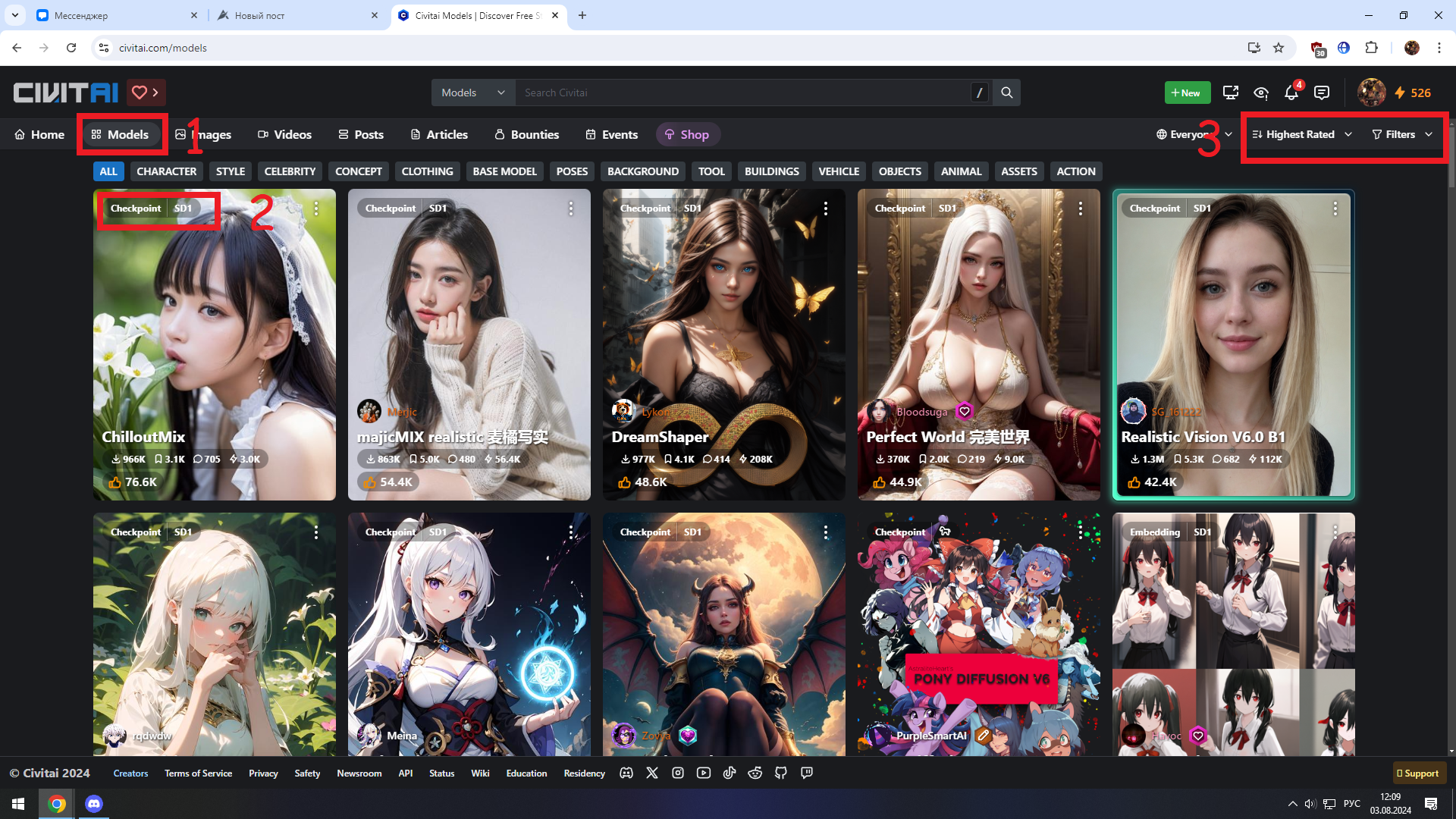 На самом сайте модели помечены плашкой checkpoint поверх изображения (2). Приписки справа SD1, XL и Pony (значок лошадки) это грубо говоря тип модели.