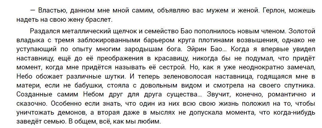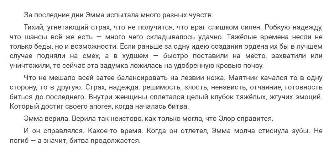 Повествование от третьего лица. Причем, что забавно, автор игнорирует рекомендации всяких гуру начинать книгу с динамичной, увлекательной сцены. Первые абзацы - о чувствах женщины. Причем автор писать о чувствах не очень умеет, просто перечисляет названия эмоций. Но - заметьте! - книга, размещенная на "мужском" сайте, начинается с описания чувств женщины. То есть автор идет поперек всех рекомендаций всяких гуру. При этом АР автора - 17 млн с лишним, конкретно у этого текста - более тысячи лайков, 180 с лишним наград. Начата выкладка совсем недавно - 25 июля. Сегодня 4 августа. Профи говорят, что количество наград и покупок соотносится примерно как 1:10, так что считайте: почти две тысячи продаж по цене 150+ рублей за 10 дней. Арифметика простая. Завидуйте молча.