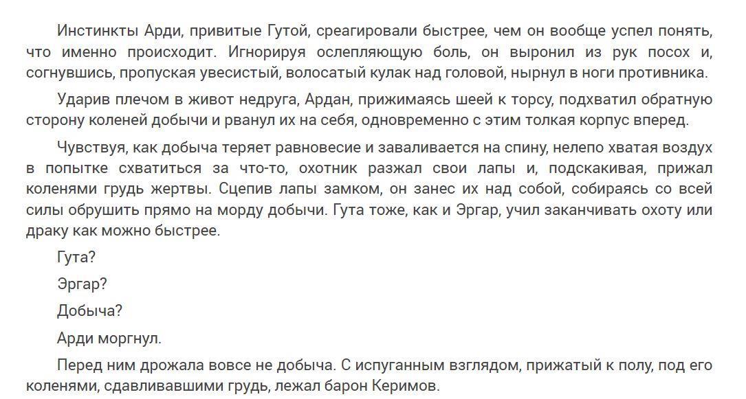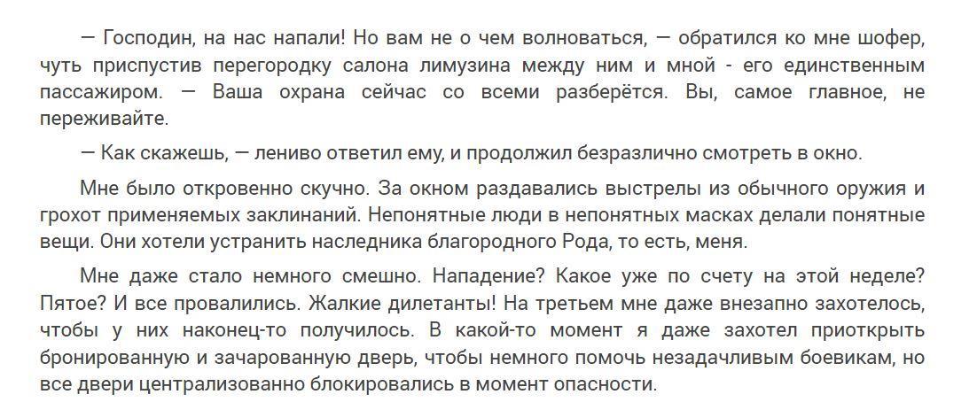 Повествование от третьего лица. Пожалуй, наиболее "грязный" из отрывков. "Хватает-схватиться" в одной фразе, штамп "ослепляющая боль"... Впрочем, это - не начала текста, а глава №61, текст порезан на книги как попало. Давно популярный Кирилл Клеванский закруглился со своими "Драконами" и начал новый цикл в новом мире. Насколько будет удачным - покажет время.