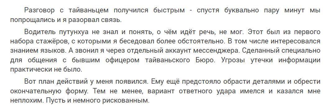 Повествование от первого лица. Ясный, четкий стиль. Единственное малоизвестное слово - путунхуа. По контексту понятно, что это - название языка. Пока в России немногие знают, что основная масса китайцев говорит не на китайском языке, которого как такового не существует, как не существует, скажем, "иранского" или "индийского" языков, а на этом самом путунхуа. И на нем же говорят жители Тайваня. Впрочем, отрывок - из шестого тома дорамы, действие которой разворачивается в Юго-Восточной Азии, так что читатель уже наверняка освоился с пока еще экзотическими для нас терминами.