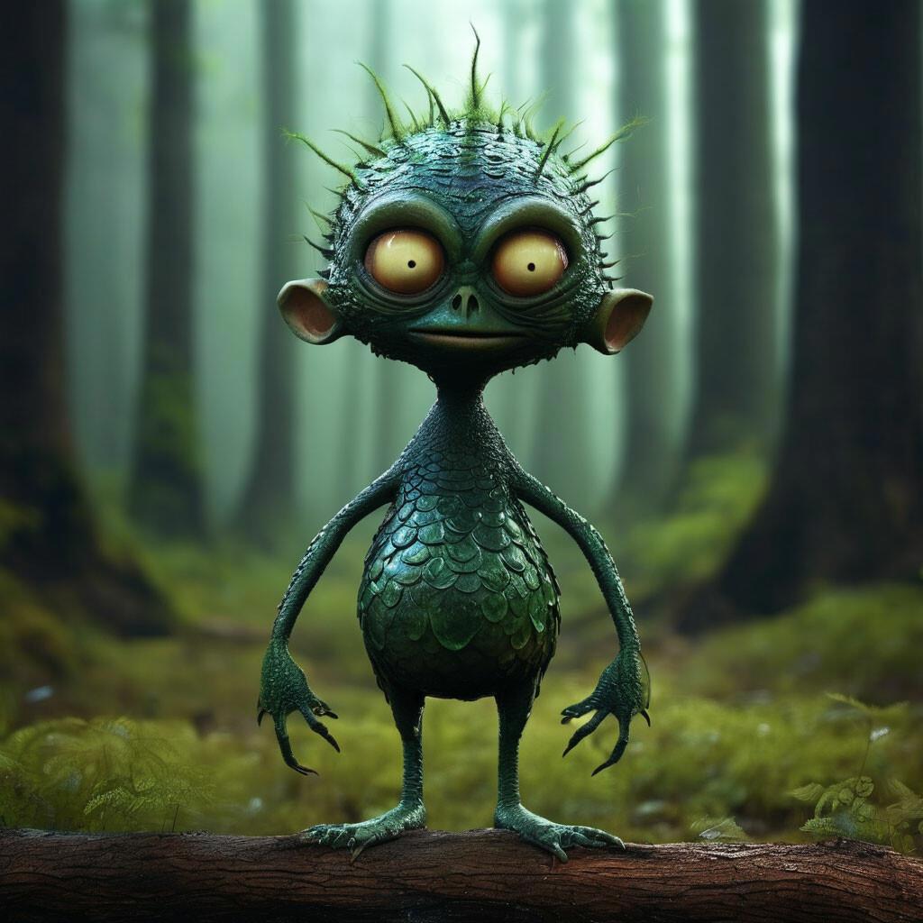 Из дупла снова высунулась голова Лотто, а за ней вылез и он сам. Это было маленькое существо с тоненькими ручками и ножками и круглым животом, как у лягушки. Тело Лотто было покрыто зеленой чешуей и переливалось в лучах солнечного света.