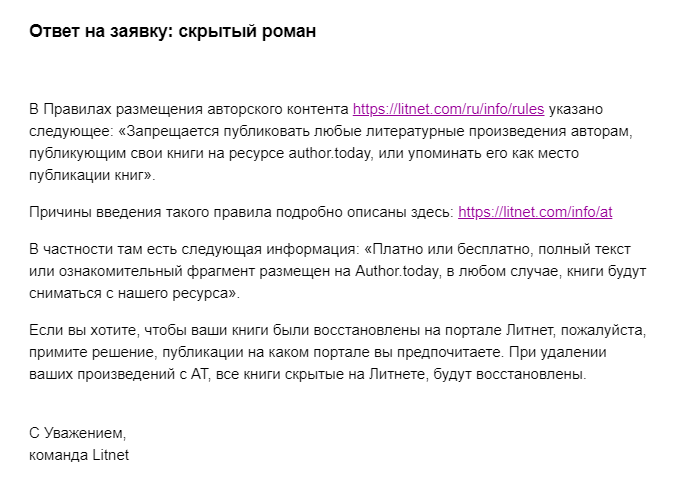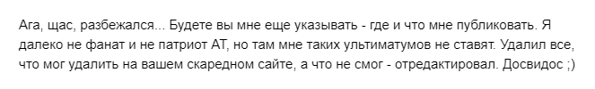 Я в курсе срача между АТ и Литнетом, но не знал, что у них там настолько сильно пригорело, что они принялись ставить ультиматумы авторам, которым, по большому счету, пофиг на их разборки с АТ. Нет, ну серьезно! Да класть мне с прибором на то, с кем они там грызутся. Условия они мне будут еще ставить...