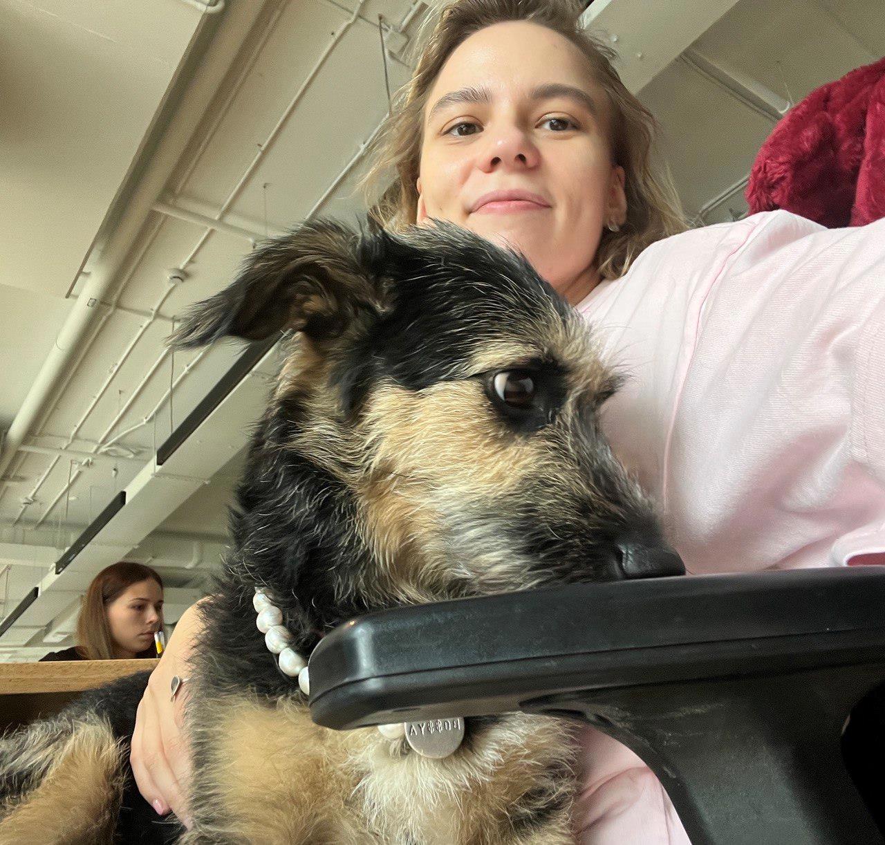 А это Настя-предательница, обнимается с чужой собакой в офисе.