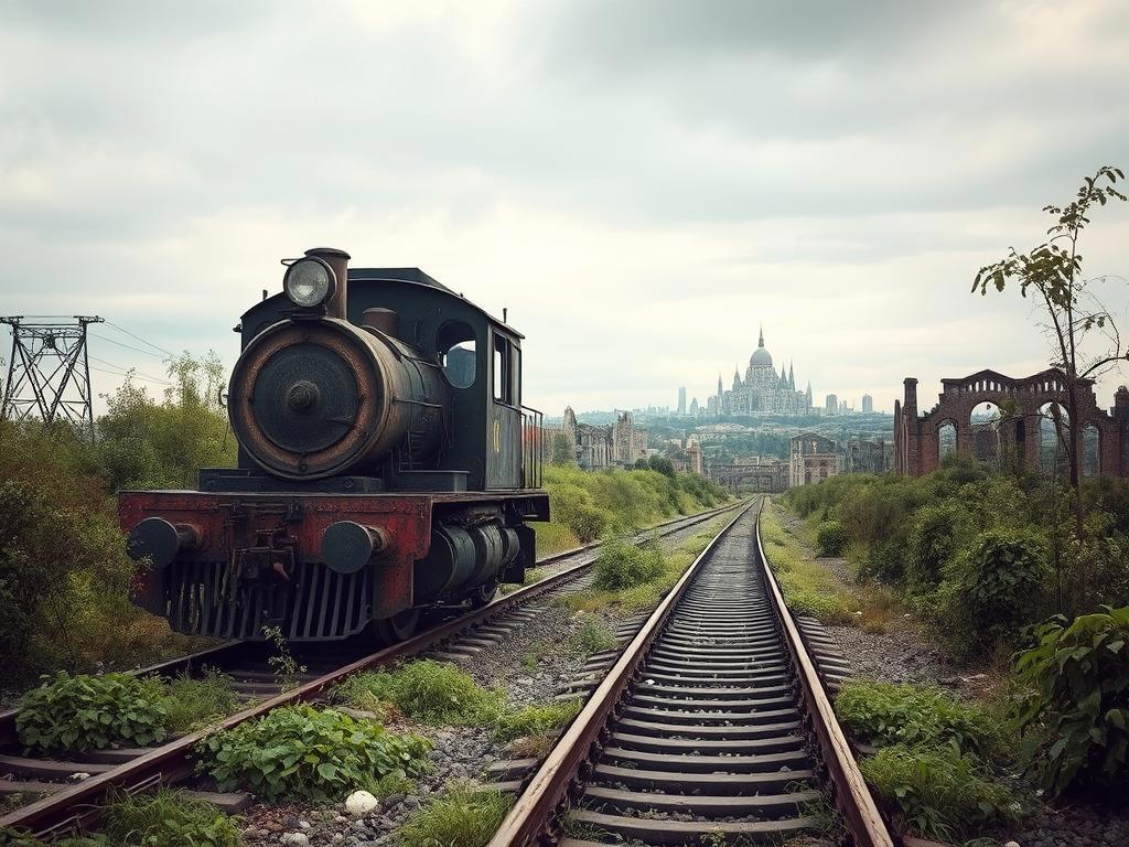 Ржавый паровоз и город вдали. Кстати, раньше нейросети и рельсы рисовали с трудом: