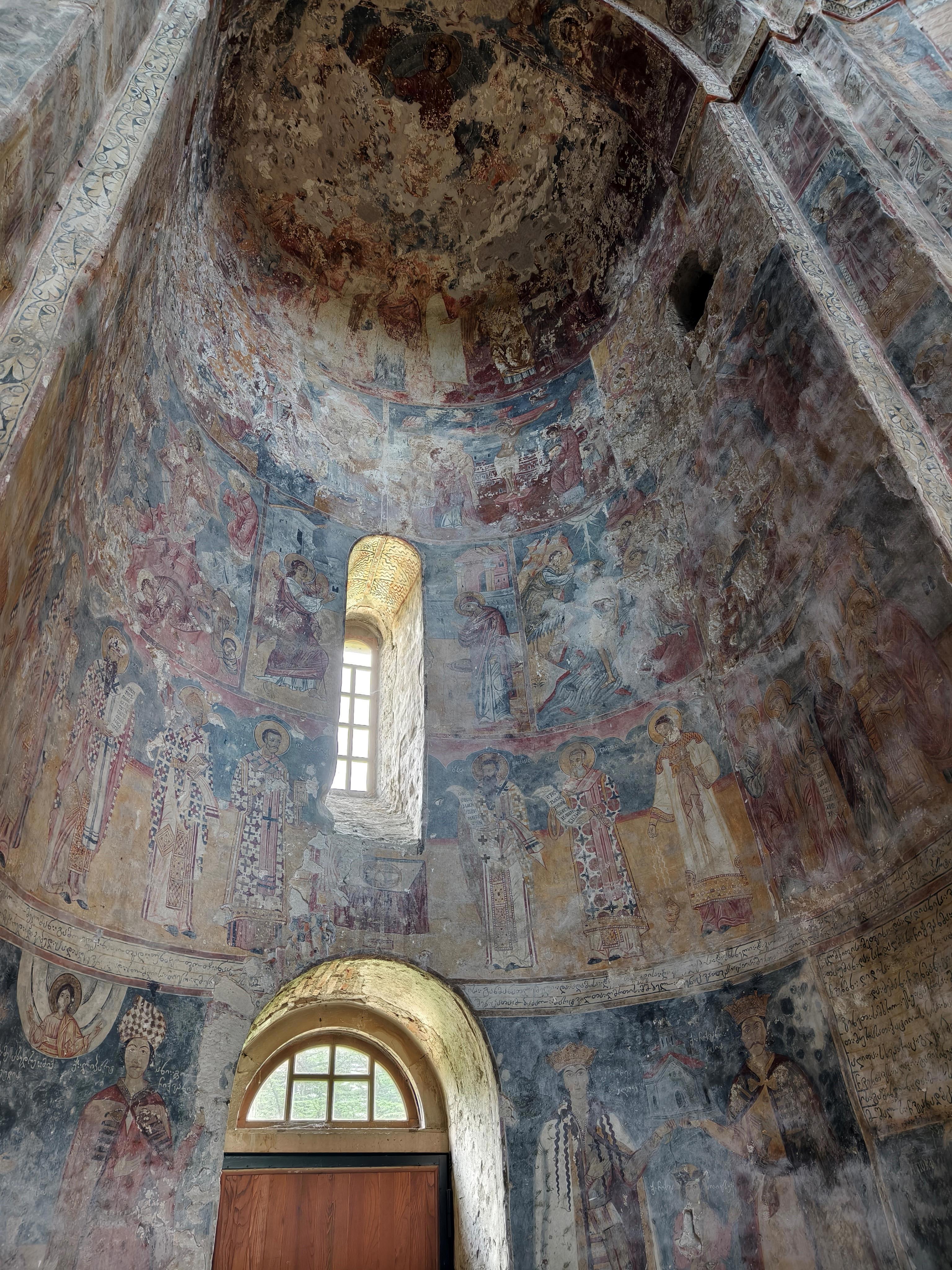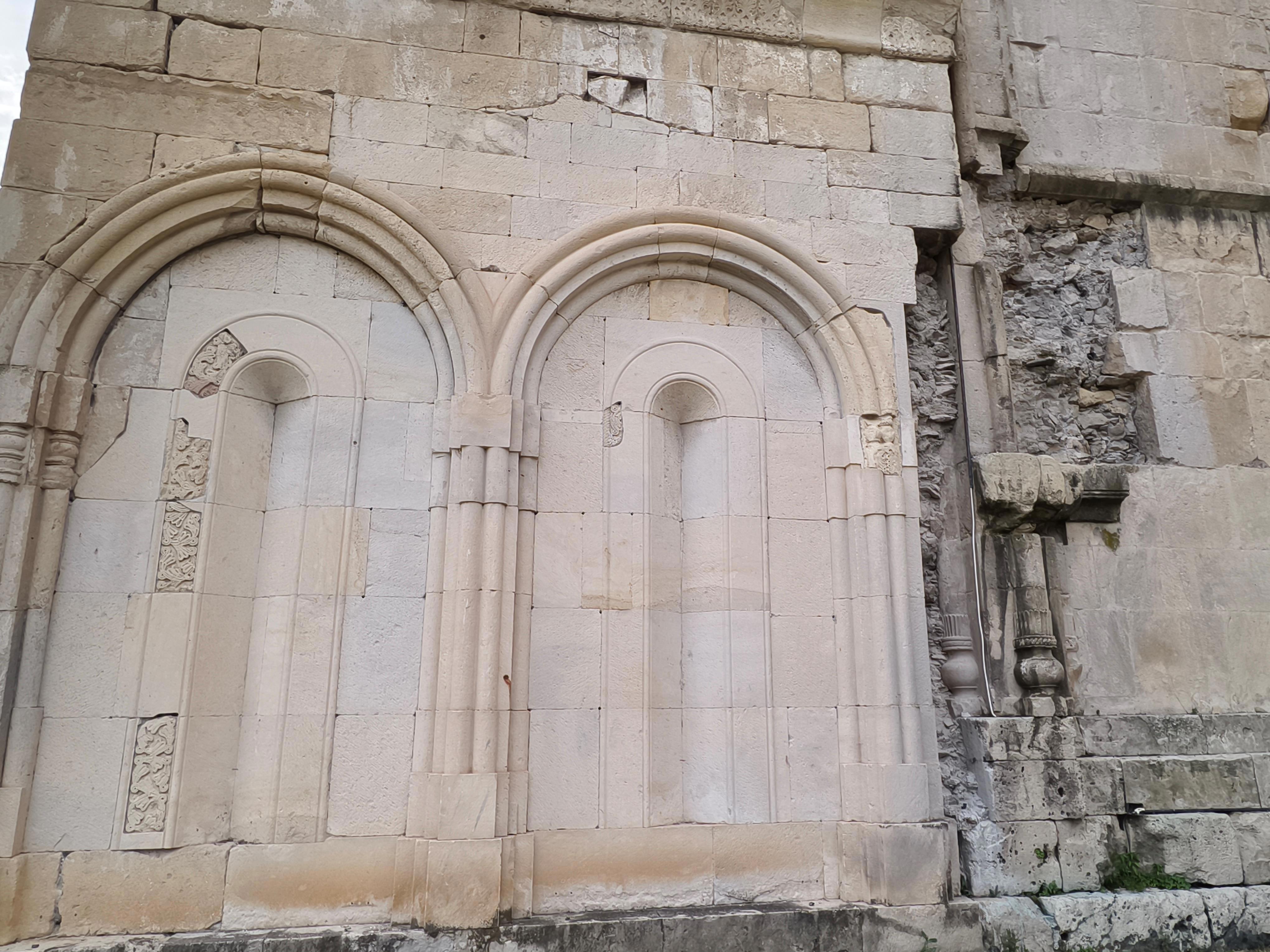 Он говорит тихо и постоянно смотрит по сторонам. Сначала мы думали, что он боится, так как скорее всего ему нельзя вести экскурсии внутри храма, но на улице он ведёт себя точно также. Вдобавок, он слегка искажает исторические факты, которые мы уже знаем. Возраст виноделия у него уходит в 15 век до нашей веры, возраст храма тоже неясен. То он говорит о том, что храму в таком виде, как мы его наблюдаем, полтора века, то о том, что в 16 веке его практически заново построили, поменяв вид, а потом у него вдруг слышится 16 век до нашей эры и он это повторяет несколько раз.