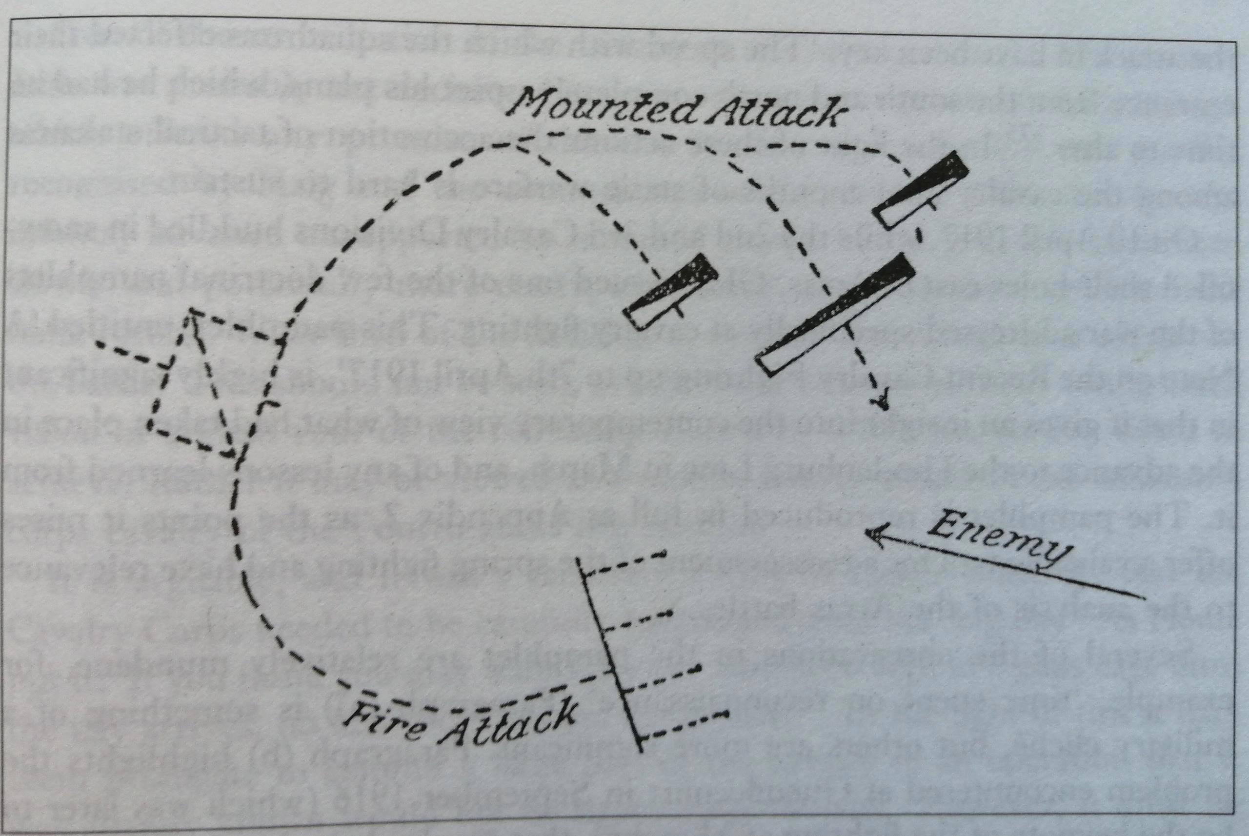 Проблема тактики видна из рисунка — нужно место для флангового охвата маневренной компонентой, что не про Западный Фронт ПМВ. Впрочем, как можно узнать по ссылке, джентельмены находили возможности для конных атак и там. В конце ПМВ британская кавалерия действовала совместно с танками.