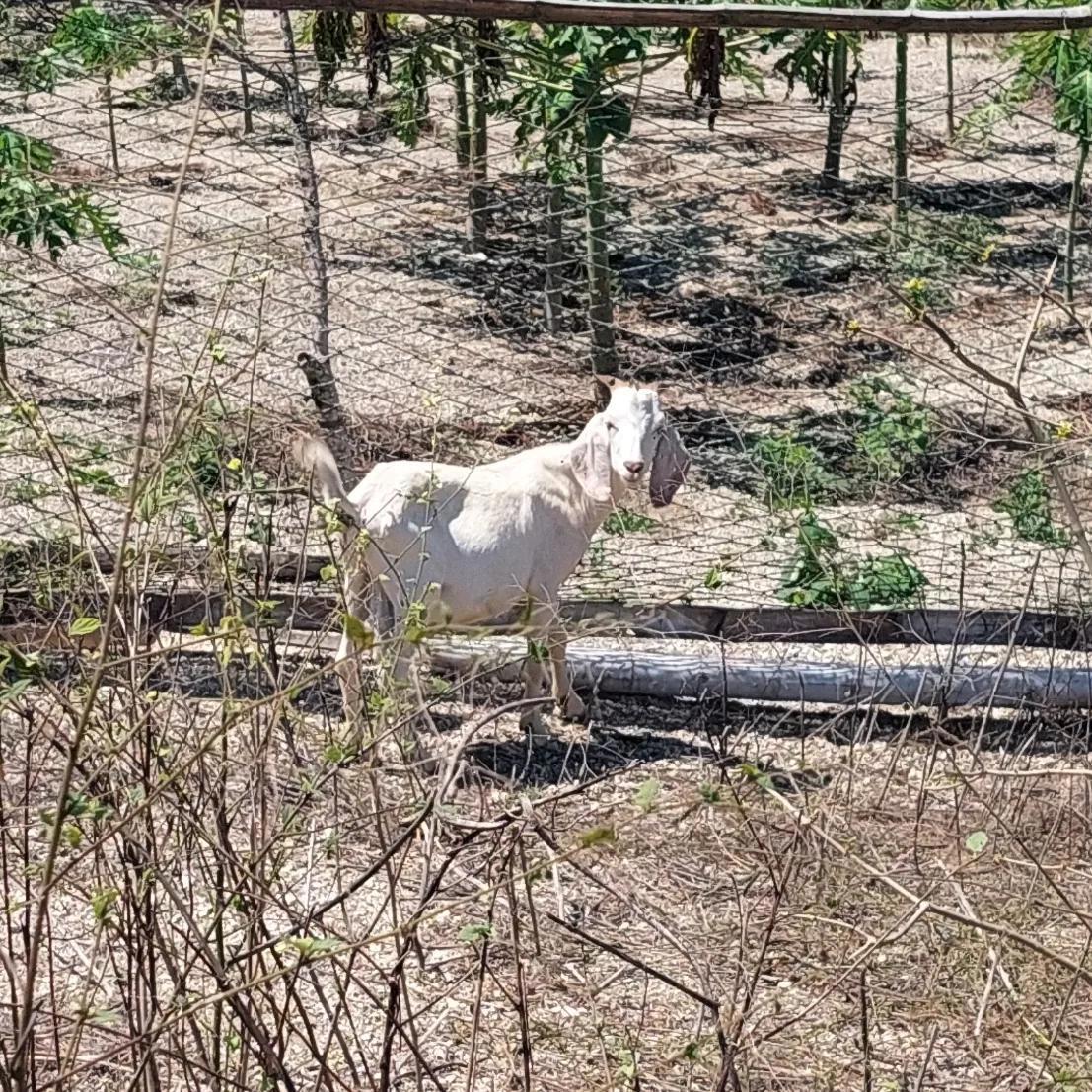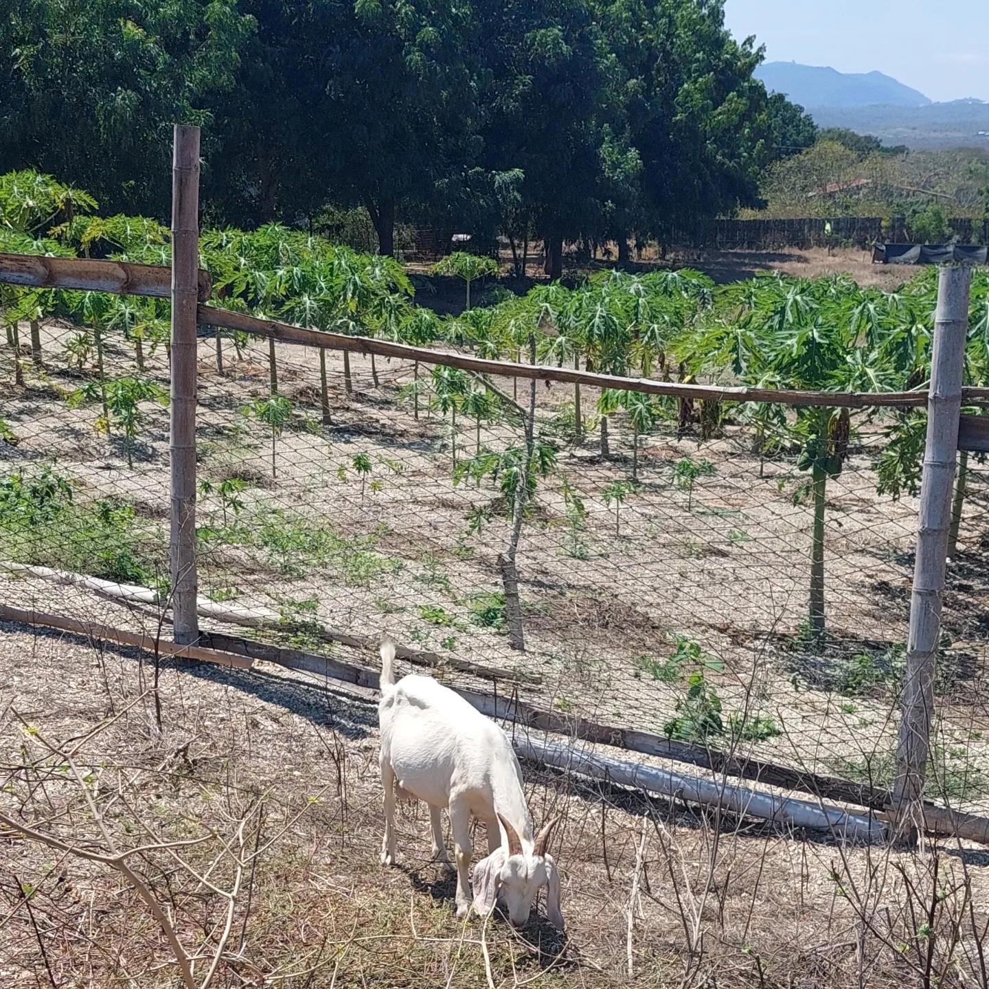 Зефс (потому что Зефир) недоумевает с вопиющей несправедливости: за забором папайи и все зелененькое, а им - сушняк.