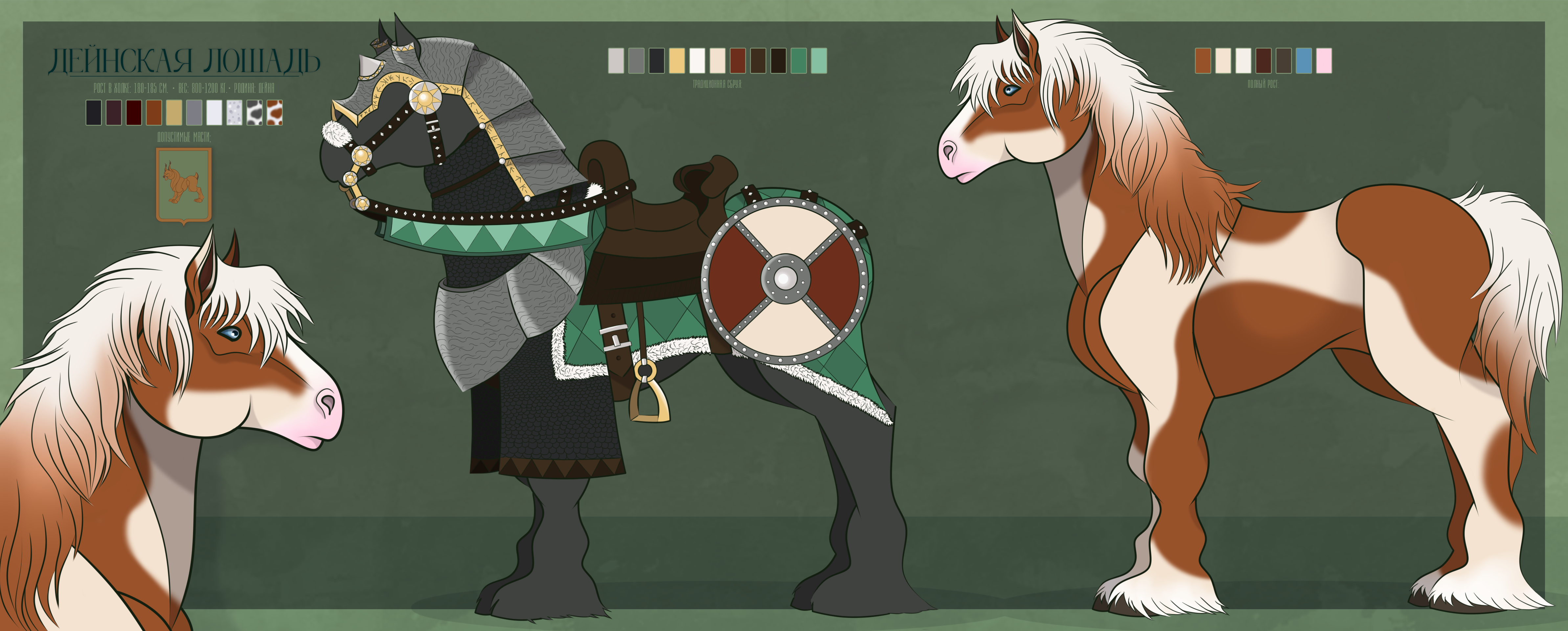 Автор: EllardДЕЙНСКАЯ ЛОШАДЬ – крупнейшая из ныне живущих лошадей, ставшая надежной опорой завоевателям из Дейны. Пускай эти кони служили тогда не верховыми, а тягловыми животными, но именно с ними завоеватели из-за моря покоряли Единый Материк и строили великую Северную империю.