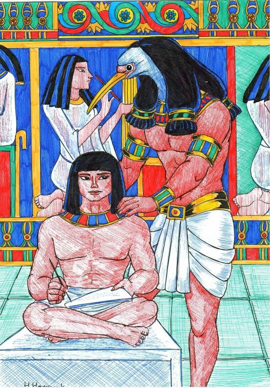 Потому что в её интерпретации это реально - бог-покровитель не только писцов и учёных, но и писателей! Можно сказать - более надёжная, серьёзная и ответственная альтернатива ветреных и капризных муз. Так сказать - музЫк!)))